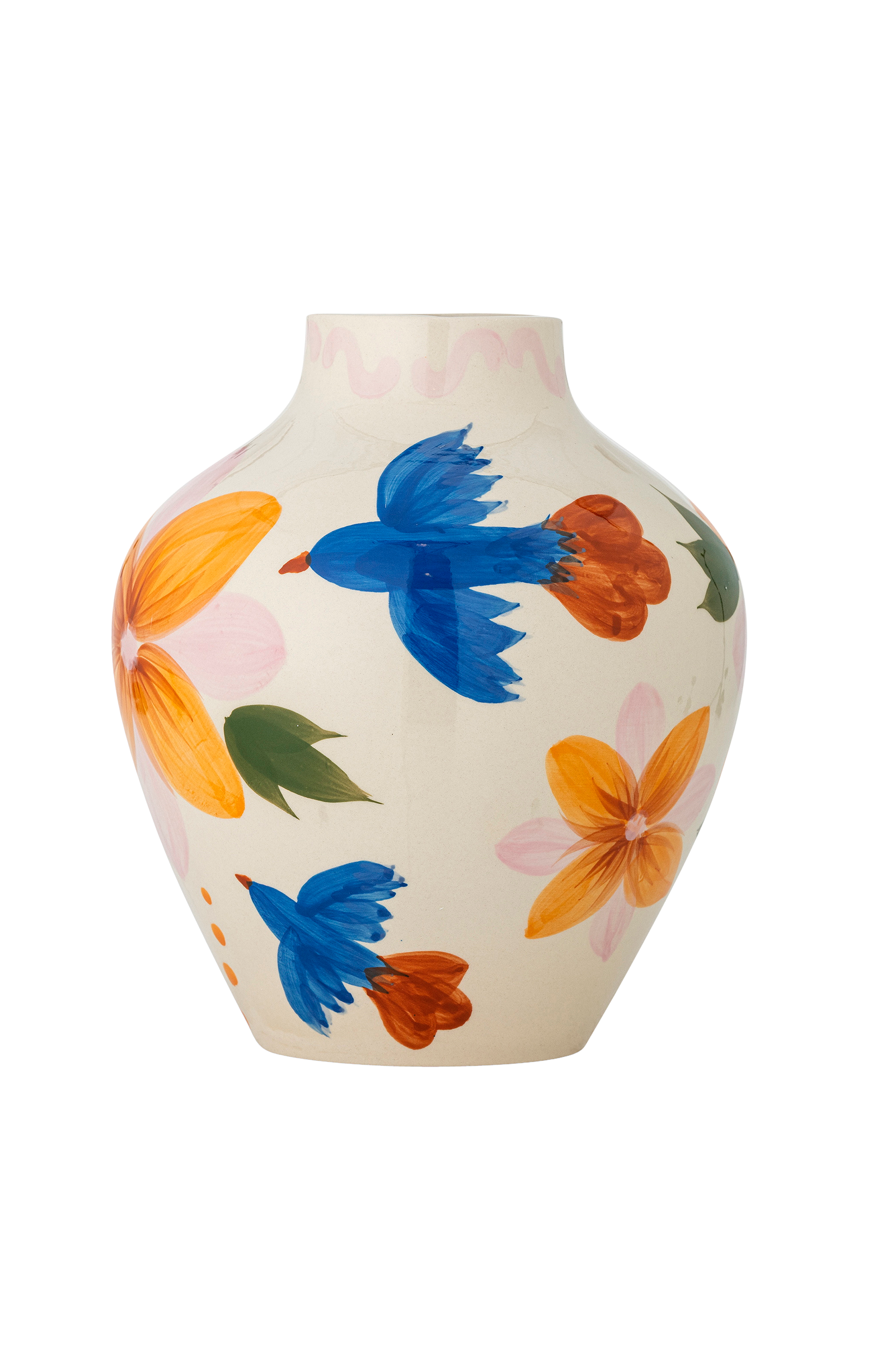 Vasen Maricala från bloomingville är tillverkad i stengods med ett handmålat motiv av fåglar, blad och blomdetaljer nära kanten. Variationer kan förekomma.