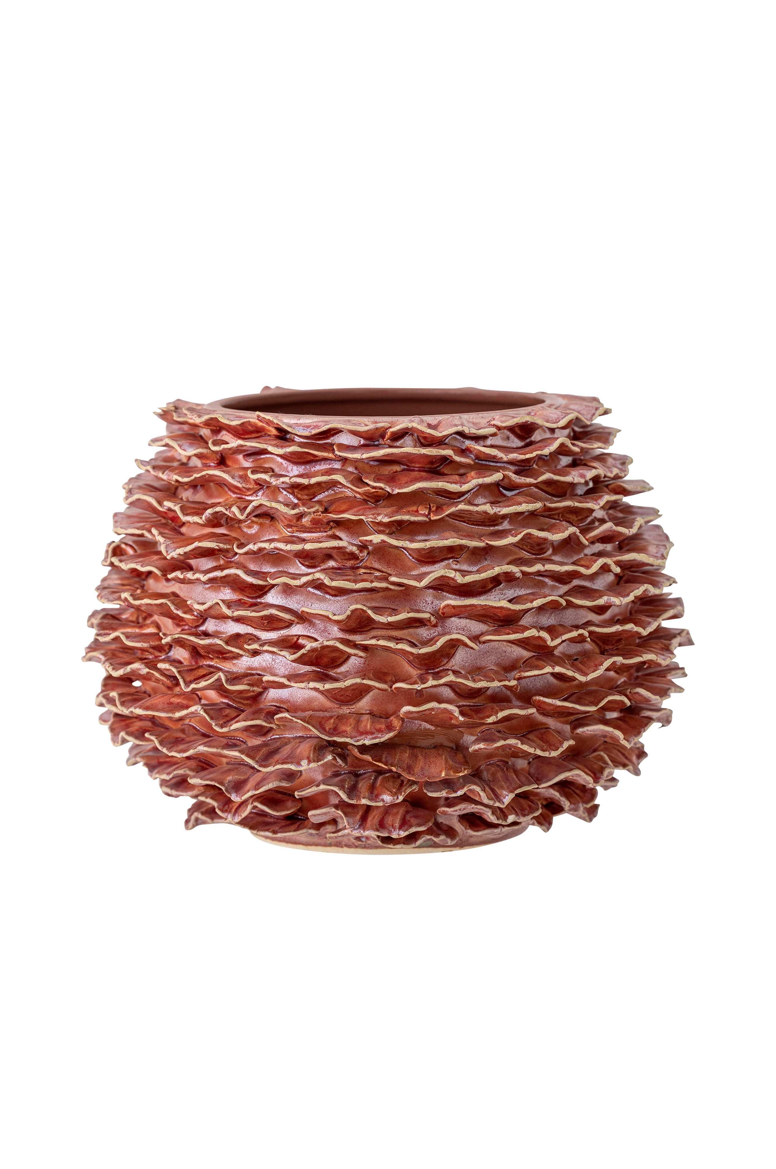 Vasen morwen från bloomingville har en röd och rosa glaserad yta med kontinuerliga, vågiga lager som ger en dynamisk textur. Den uttrycksfulla designen fångar ögat och gör vasen till en konstnärlig mittpunkt. Vasen är tillverkad av stengods och glasyren kan variera i färg. Mått: d22xh16 cm
