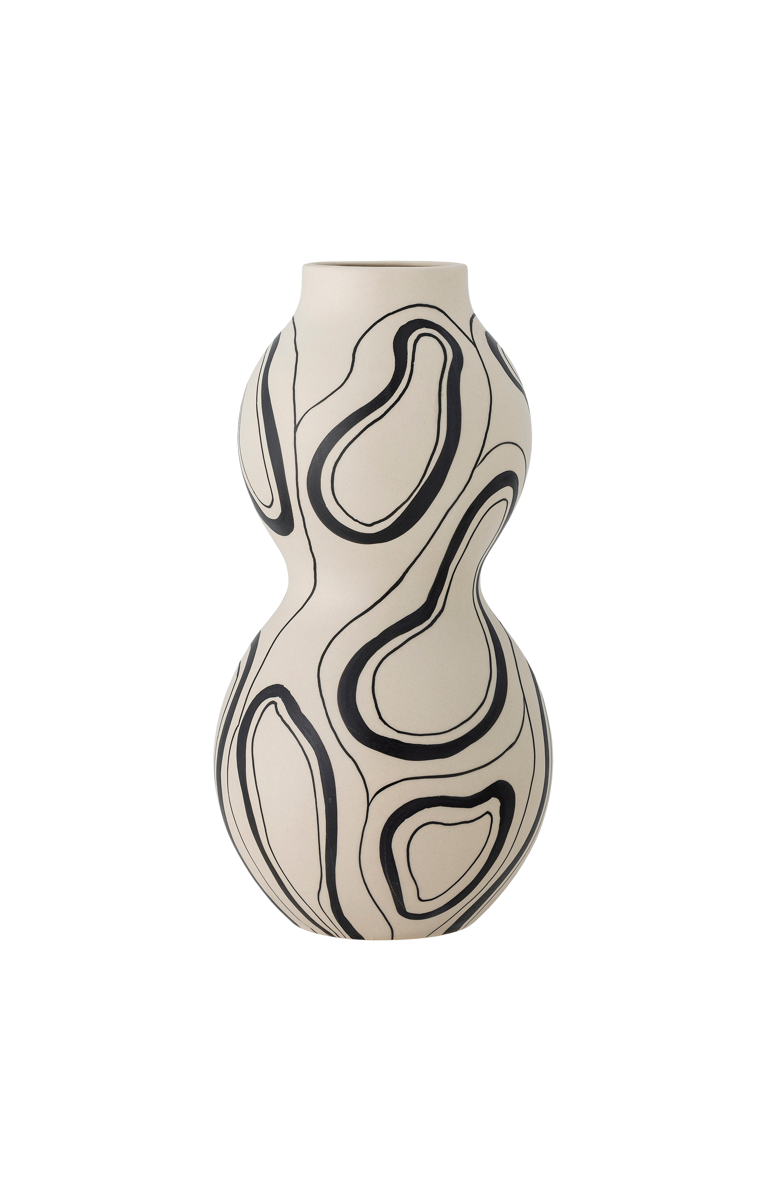 nicola vasen från bloomingville är utsmyckad med en enkel och vacker design. Det svarta, organiska mönstret kontrasterar vackert mot den neutrala basen. Placera den som mittpunkt på bordet eller i fönsterkarmen för att skapa ett stilfullt uttryck. Mått: d17,5xh34 cm