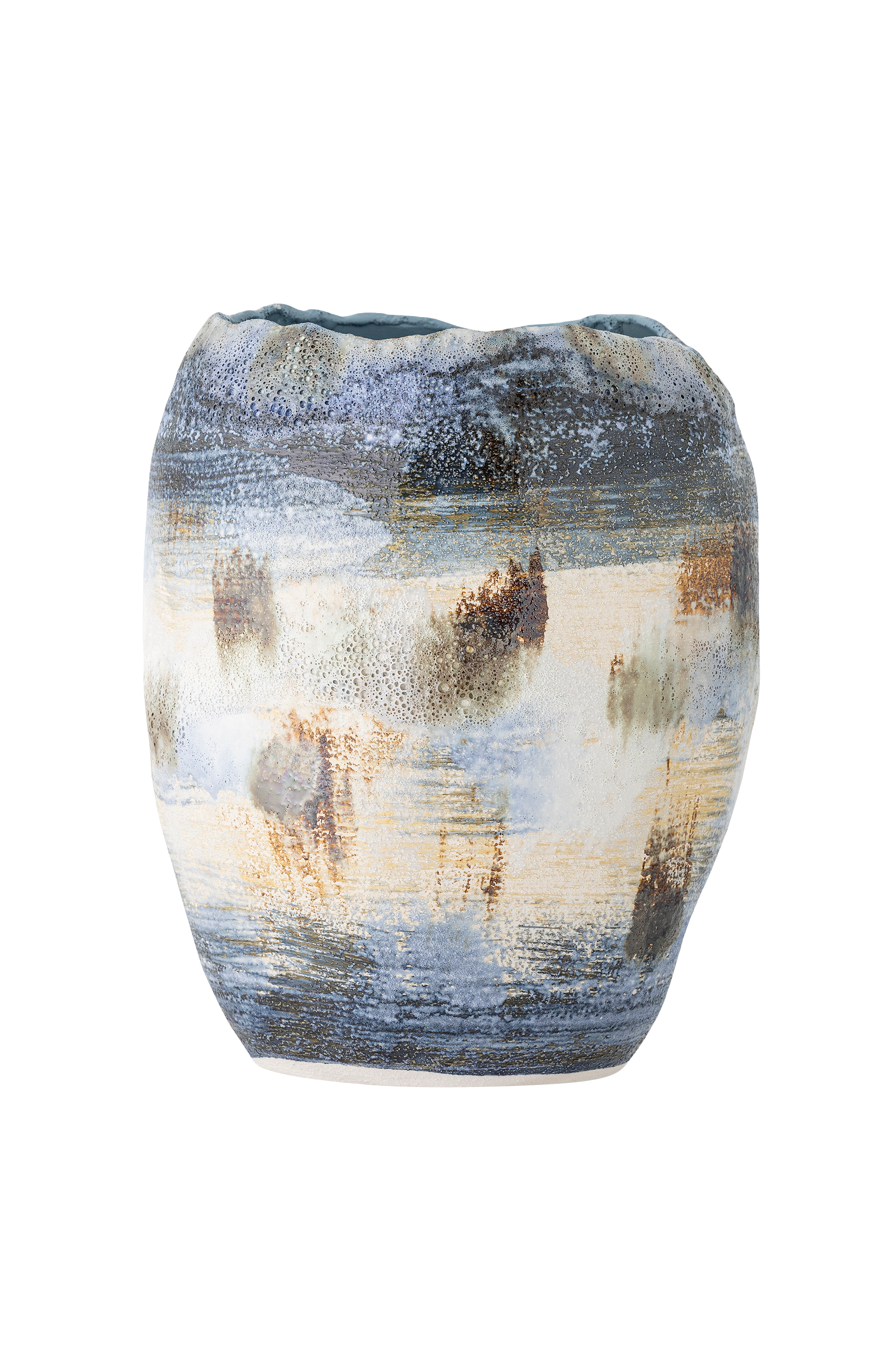 nienna vasen från bloomingville är tillverkad av stengods och har en oregelbunden form som ger vasen ett autentiskt utseende. Det vackra färgspelet i glasyren, i nyanser av blått, vitt och brunaktiga toner, gör varje vas helt unik. Vasen kan användas som ett dekorativt föremål ensam eller med torkade eller färska blommor. Mått: d25,5xh31 cm