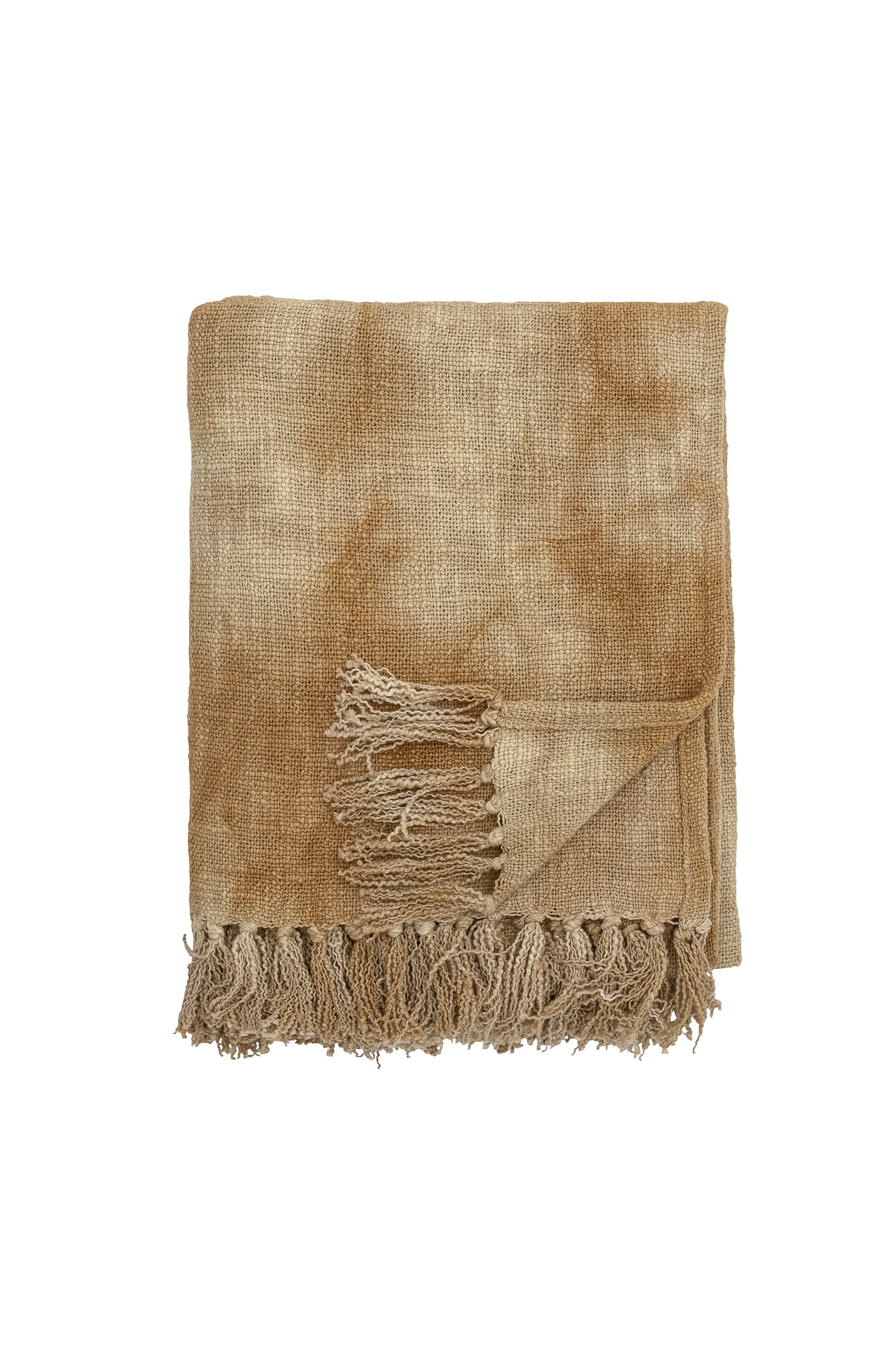 Thelma pläd från Bloomingville är tillverkad av bomull i gula nyanser. Den är tryckt med ett tie-dye-mönster och har dekorativa fransar, vilket ger rummet en mysig stämning.