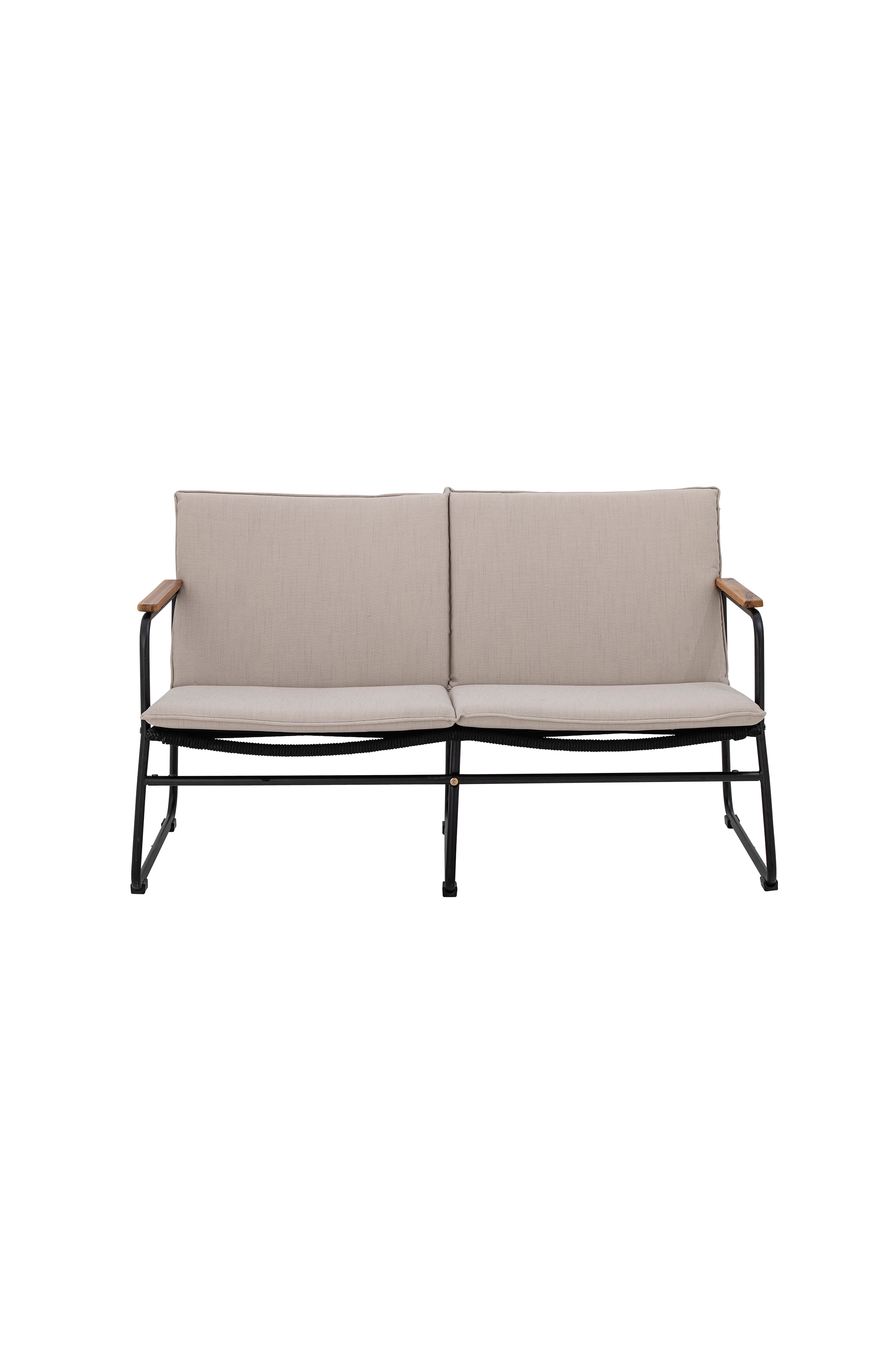 Hampton soffa från Bloomingville är perfekt under sommaren och passar fint på en liten altan eller uteplats. Soffans stomme är gjord av svart metall medan sitsen och ryggstödet är gjorda av flätat snöre. Dynorna gör den underbar att sitta i. Armstöden är täckta med akaciaträ som kan underhållas genom att slipa lätt och behandla med olja. Skötselråd för dynorna: smuts kan tvättas bort med ljummet vatten och soffan rekommenderas att förvaras övertäckt och inomhus under vintern. Klädseln inte är vattenavvisande. Färgen kan blekna med tiden om produkten utsätts för direkt solljus.