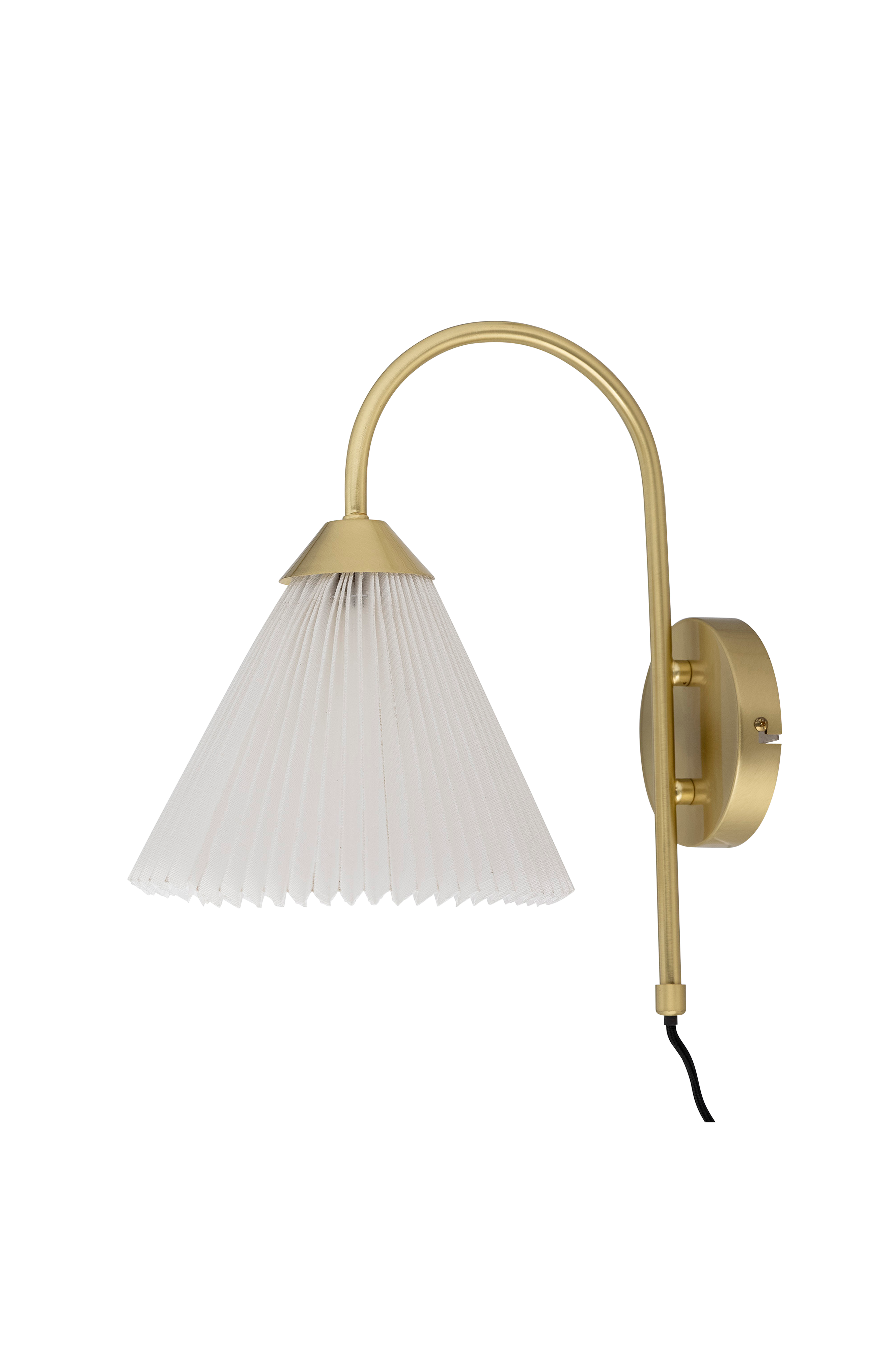 Firdes vägglampa från Bloomingville är en praktisk lampa av järn i vacker mässingfärg med klassisk lampskärm av linne. Lampan i romantisk, nordisk design passar fint på arbetsbordet eller i läshörnan, och du kommer älska dess ljus.