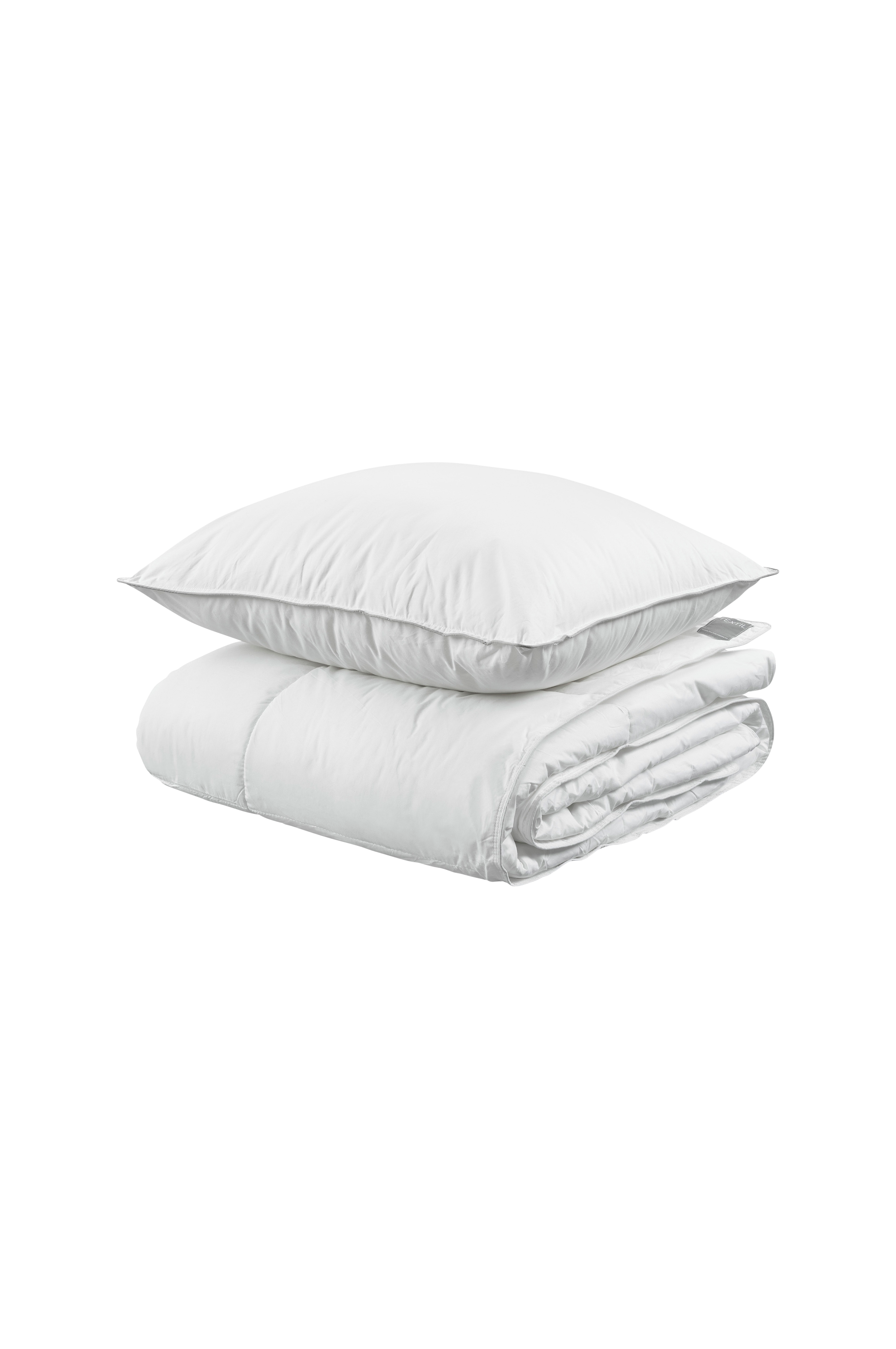 Ett set med täcke och kudde som är tillverkat av slitstark bomullscambric. Täcket är mediumvarmt, quiltat med vit piping och har en fyllning av 680 gram hål- och mikrofiber som ger en behaglig volym och den rätta hotellkänslan.kudden är en mjuk och mediumhög kudde med grå piping. Kudden har en fyllning av 650 gram hålfiber. I textilgruppens hotellserie finns täcken och kuddar i flera olika storlekar. Oeko-tex tillverkad i grönt