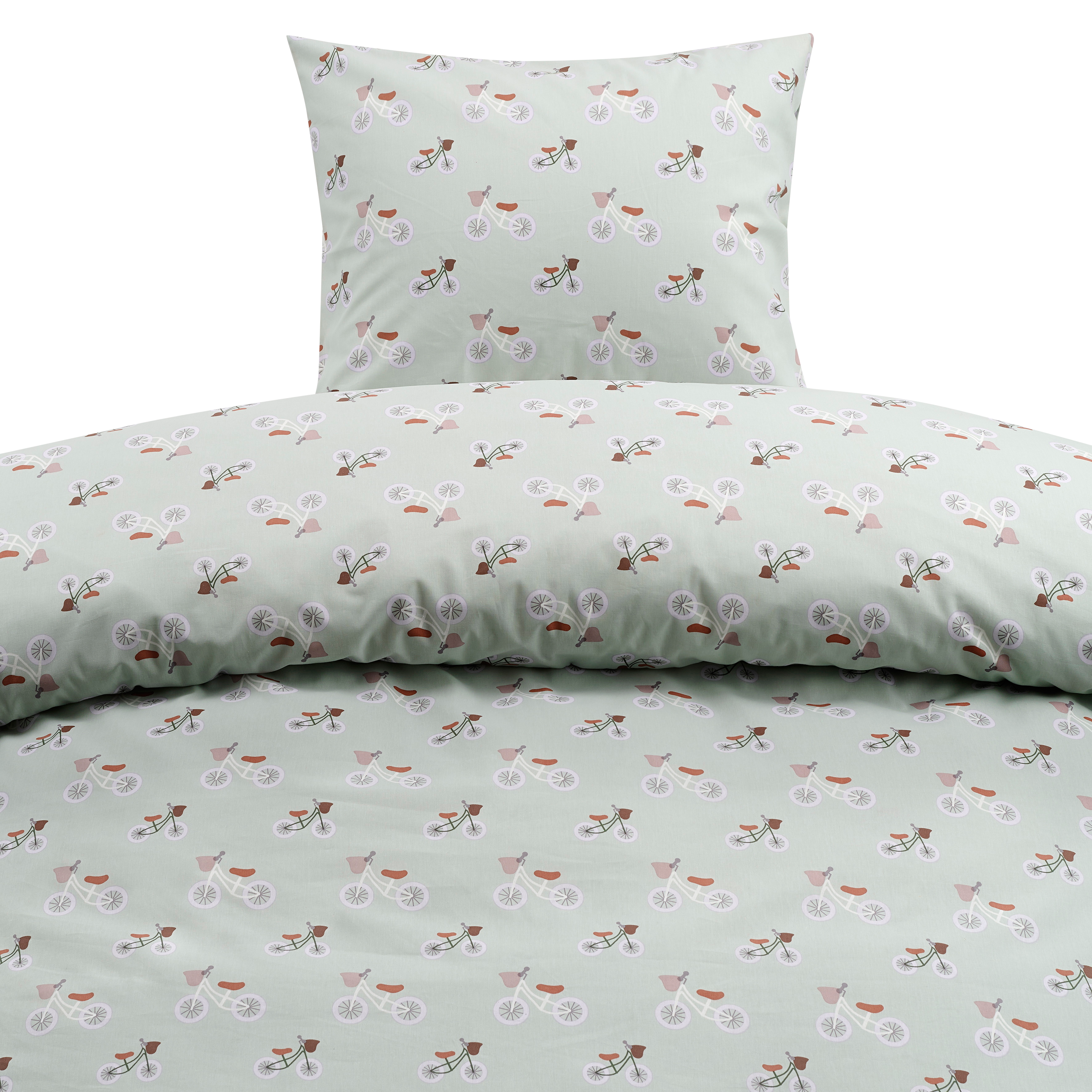 Borganäs bäddset med cykelmönster. Ett påslakan (150x210 cm) och ett örngott (50x60 cm), tillverkade av 100% bomull.