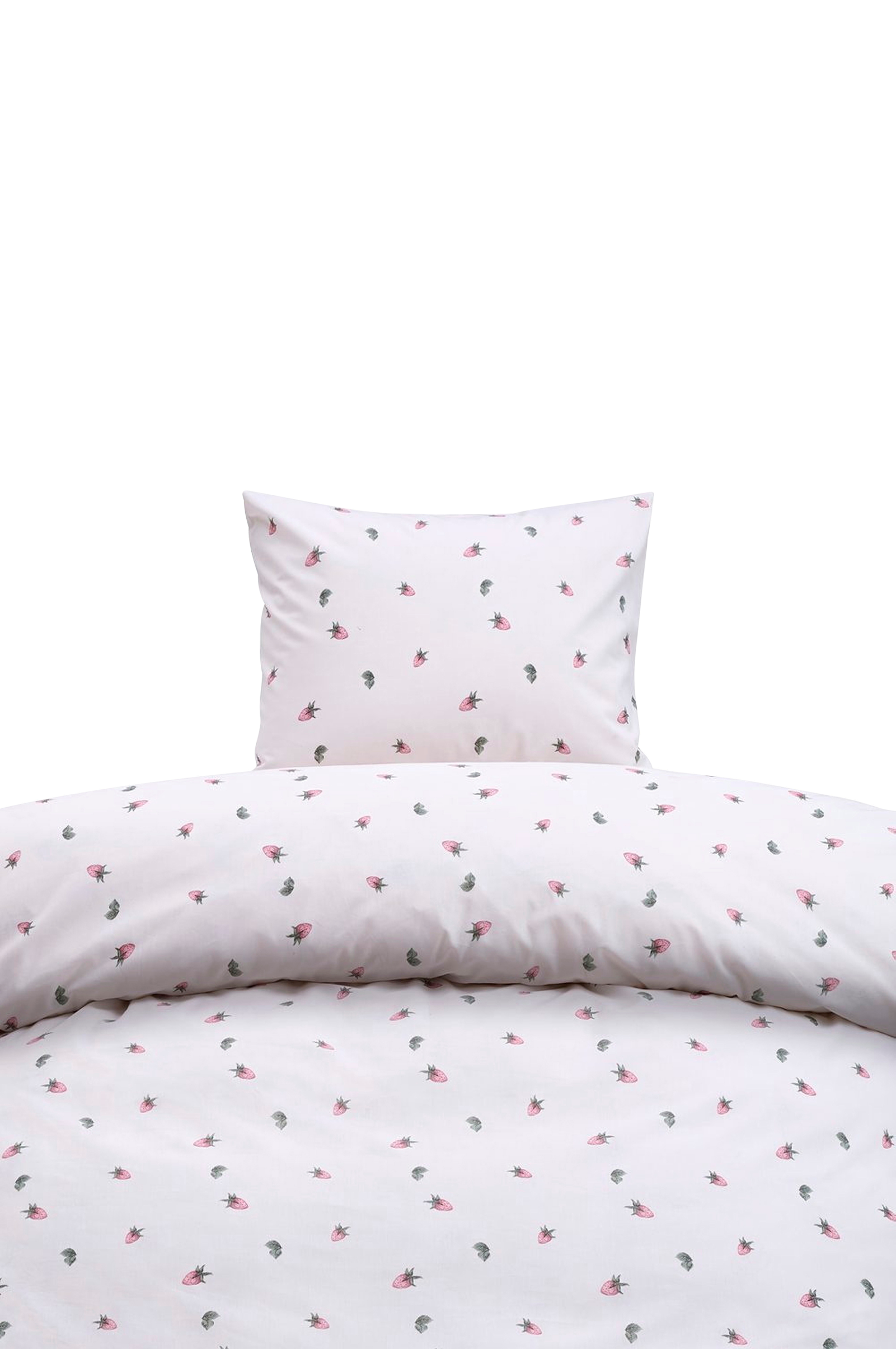 Borganäs bäddset med jordgubbar och blad, bestående av ett påslakan (150x210 cm) och ett örngott (50x60 cm), tillverkat av 100% bomull.