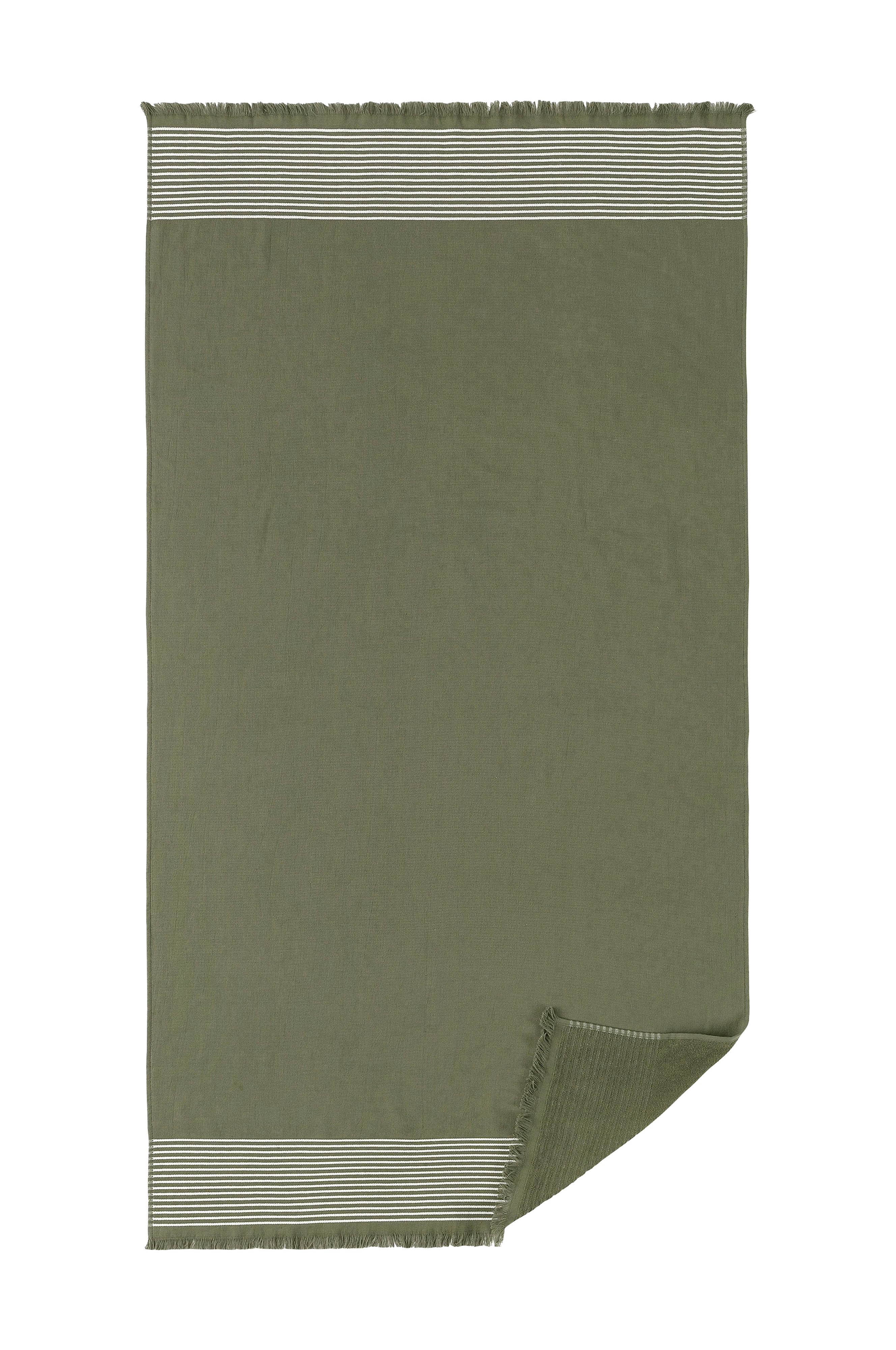 Strandhandduk med slät framsida och baksida i frotté med ögla. Vävda vita ränder, fransar på kortsidorna och en hängare på långsidan. Badhandduken är tillverkad i en lätt bomullskvalitet, vilket gör den enkel att packa med sig till stranden. Måtten är 80x160 cm. Horizon-serien finns i färgerna blå, gul, grön och mullvad. Oeko tex