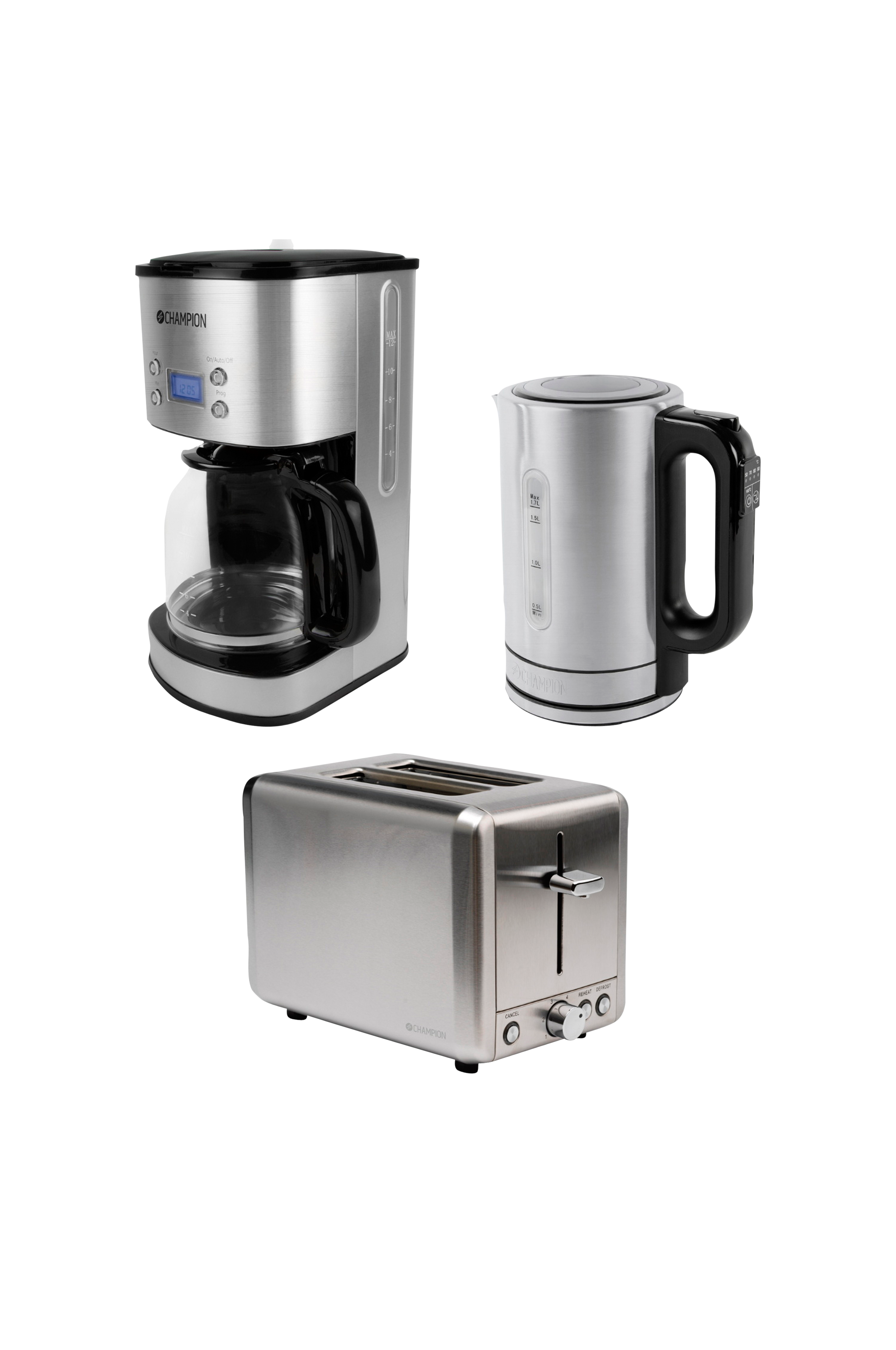 Frukostpaket med allt du behöver för att börja dagen på bästa sätt – kaffebryggare, brödrost och vattenkokare – i snygg, rostfri stål!