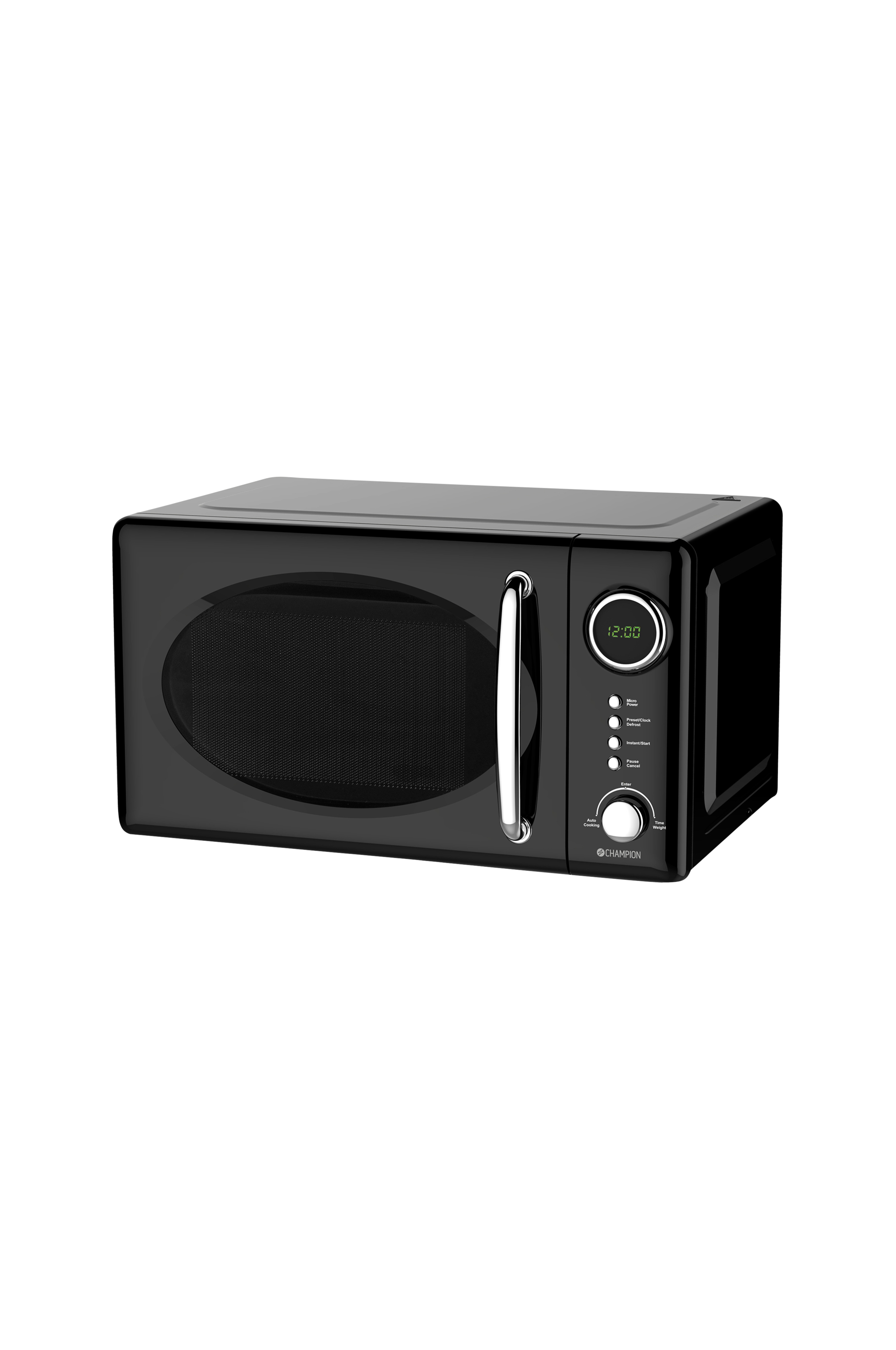 Champion CHMW020 är en mikrovågsugn i svart retrodesign med en rund digital display, ovalt fönster samt ett stilrent kromat handtag. Utrustad med allt en modern mikrovågsugn behöver så som upptiningsläge, roterande tallrik samt digital timer. Med sin rymliga kapacitet på 20 liter får du plats att värma det mesta utan svårighet. Passar lika bra att placera uppe på en bänk som inne i ett skåp.