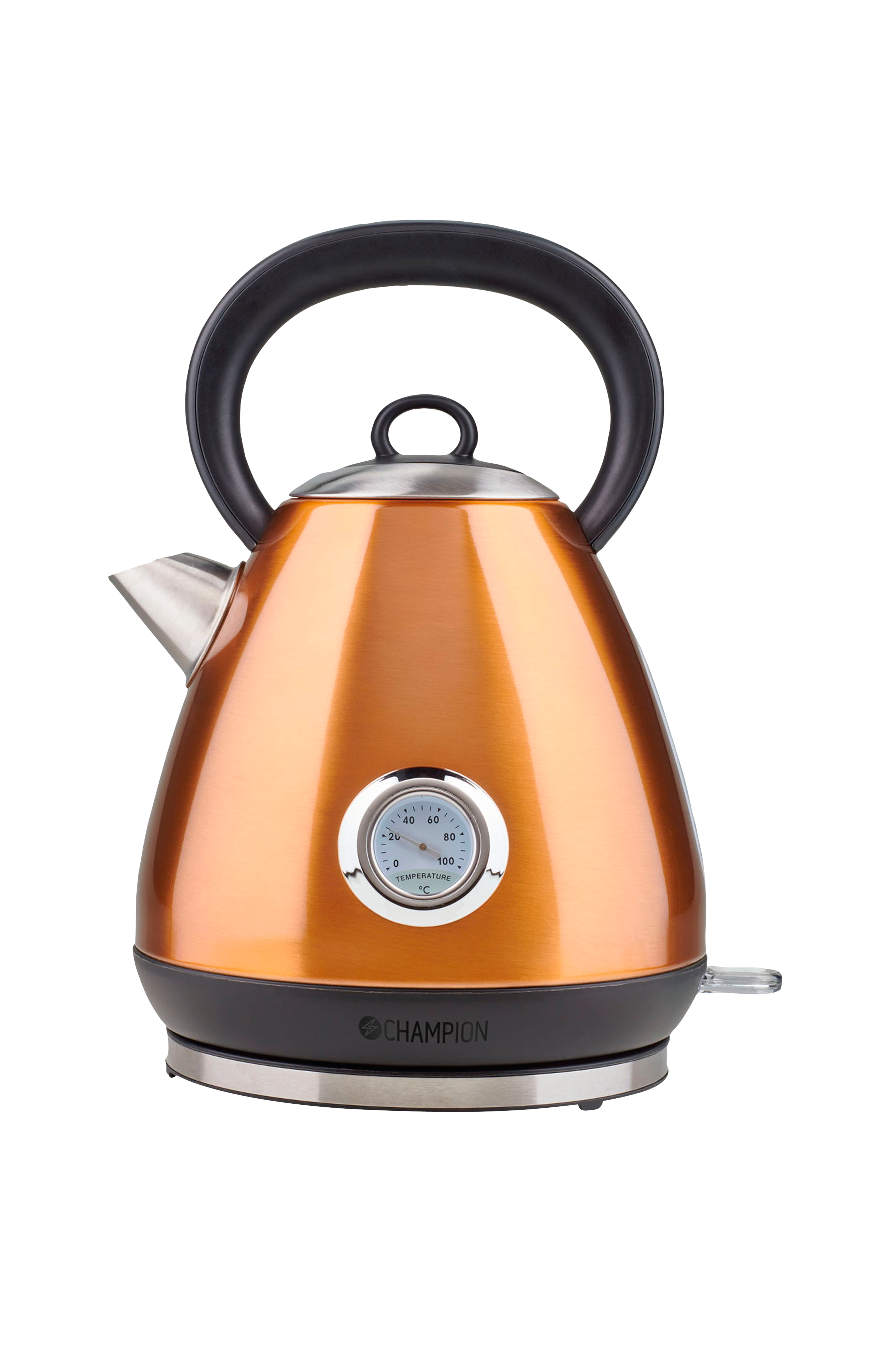 Den retroinspirerade Champion CHVK315 är vattenkokare som verkligen tar steget från de traditionella vattenkokarna och levererar snygg design i kombination med hög funktionalitet lika mycket en inredningsdetalj som en vattenkokare. CHVK315 är tillverkad i rostfritt stål som har fått en snygg koppar-finish och dessutom en klassisk analog temperatur-visare på ena sidan. CHVK310 är rymlig med sin volym på 1,7 liter och tack vare sin trådlösa design, skydd mot torrkokning samt automatisk avstängning är den både enkel och säker att använda.