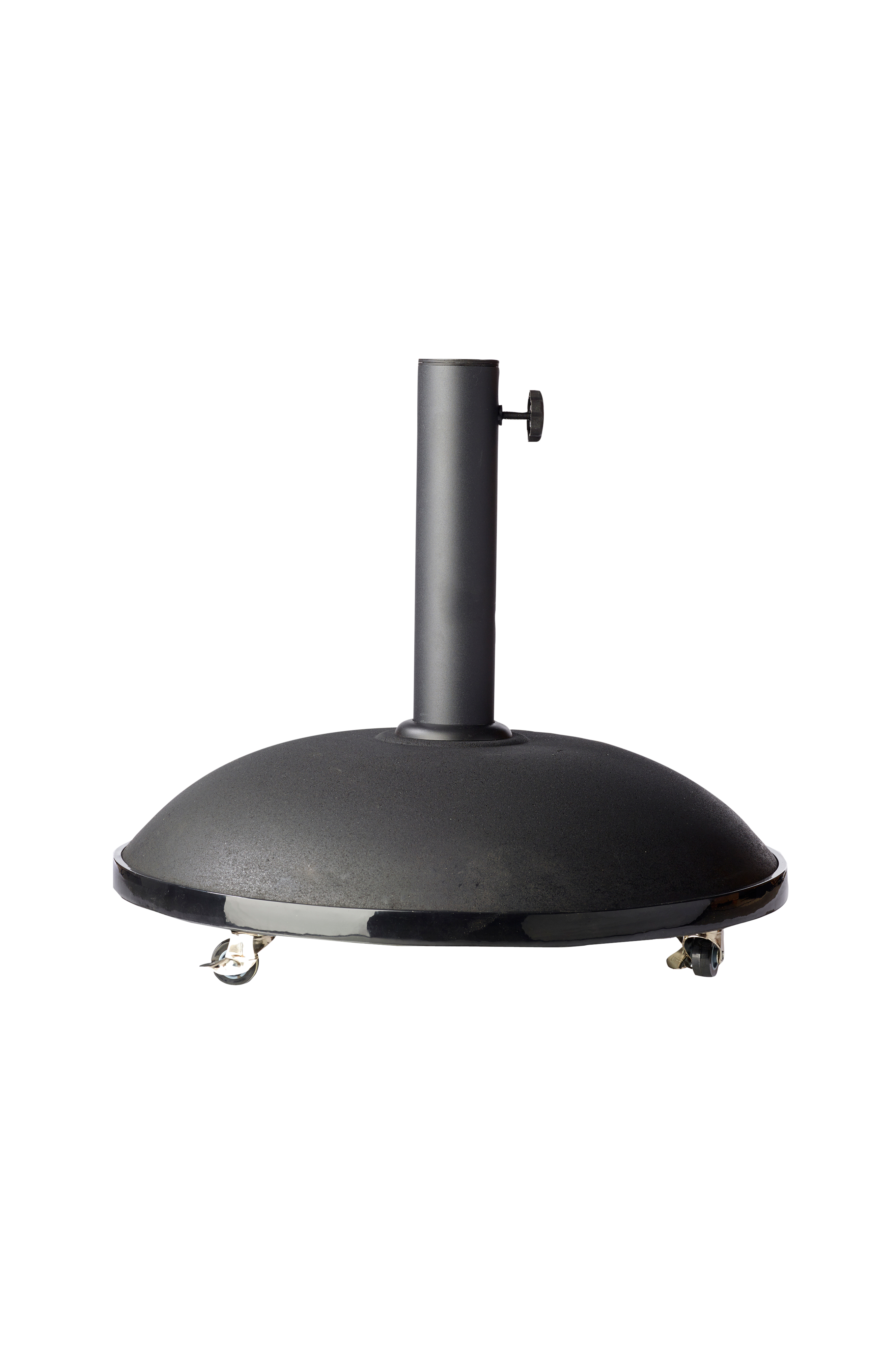 Betongfot till parasoll. Svart 50 kg, rund med svarta metallbeslag och hjul.