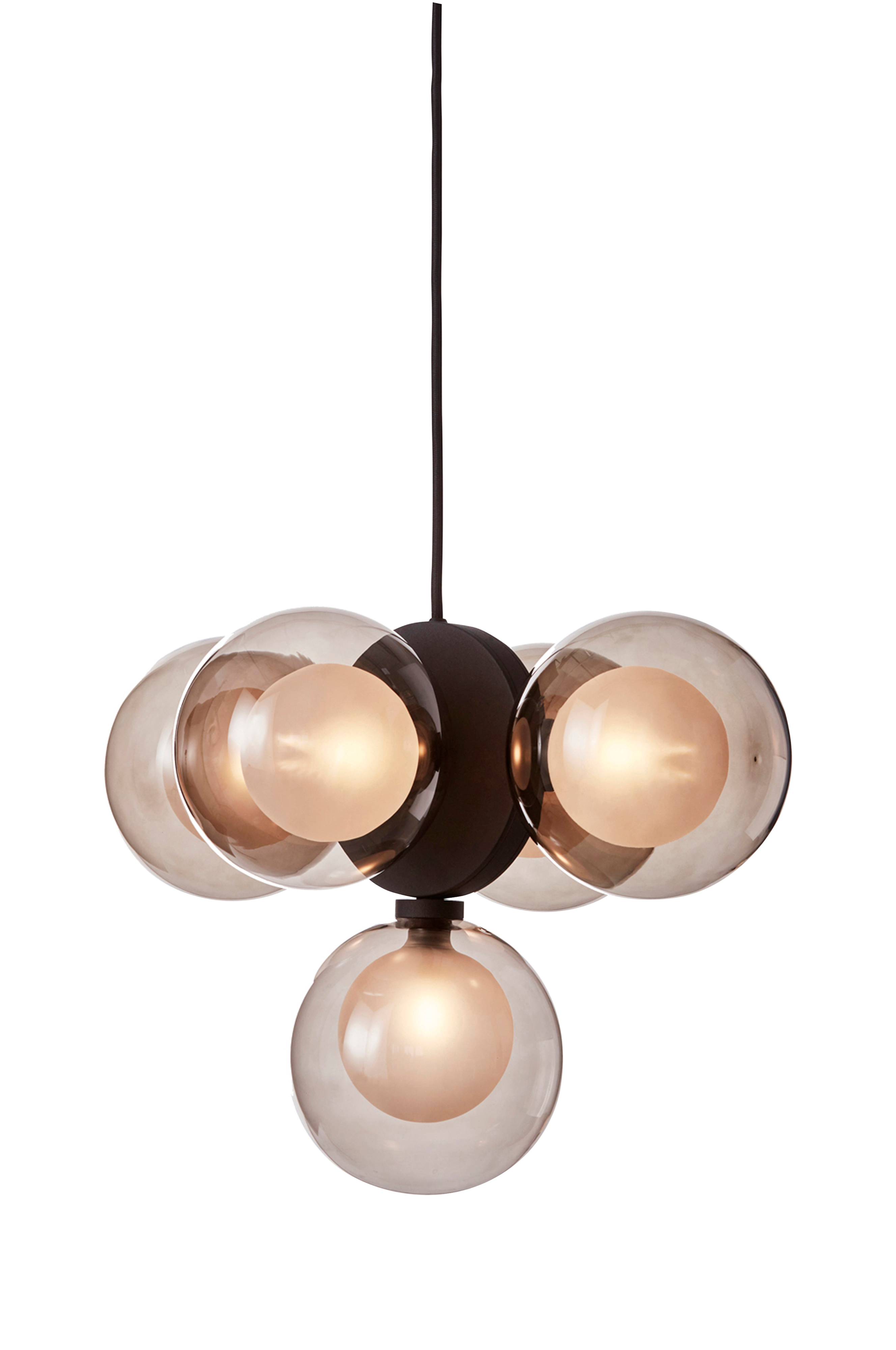 Discus har en uttrycksfull design som tar för sig och sätter stilen i ditt hem. Opalglaskuporna är inneslutna i rökt glas som ger en varm känsla. Discus 49 pendant kan med fördel hängas över ett matbord, men fungerar också i en hall. Med fem olika ljuskällor ger Discus mycket ljus och ser fin ut från alla håll. Höjd 32cm, bredd 49cm. Textilkabel 1,5meter. Ljuskällor och takkontakt ingår ej.