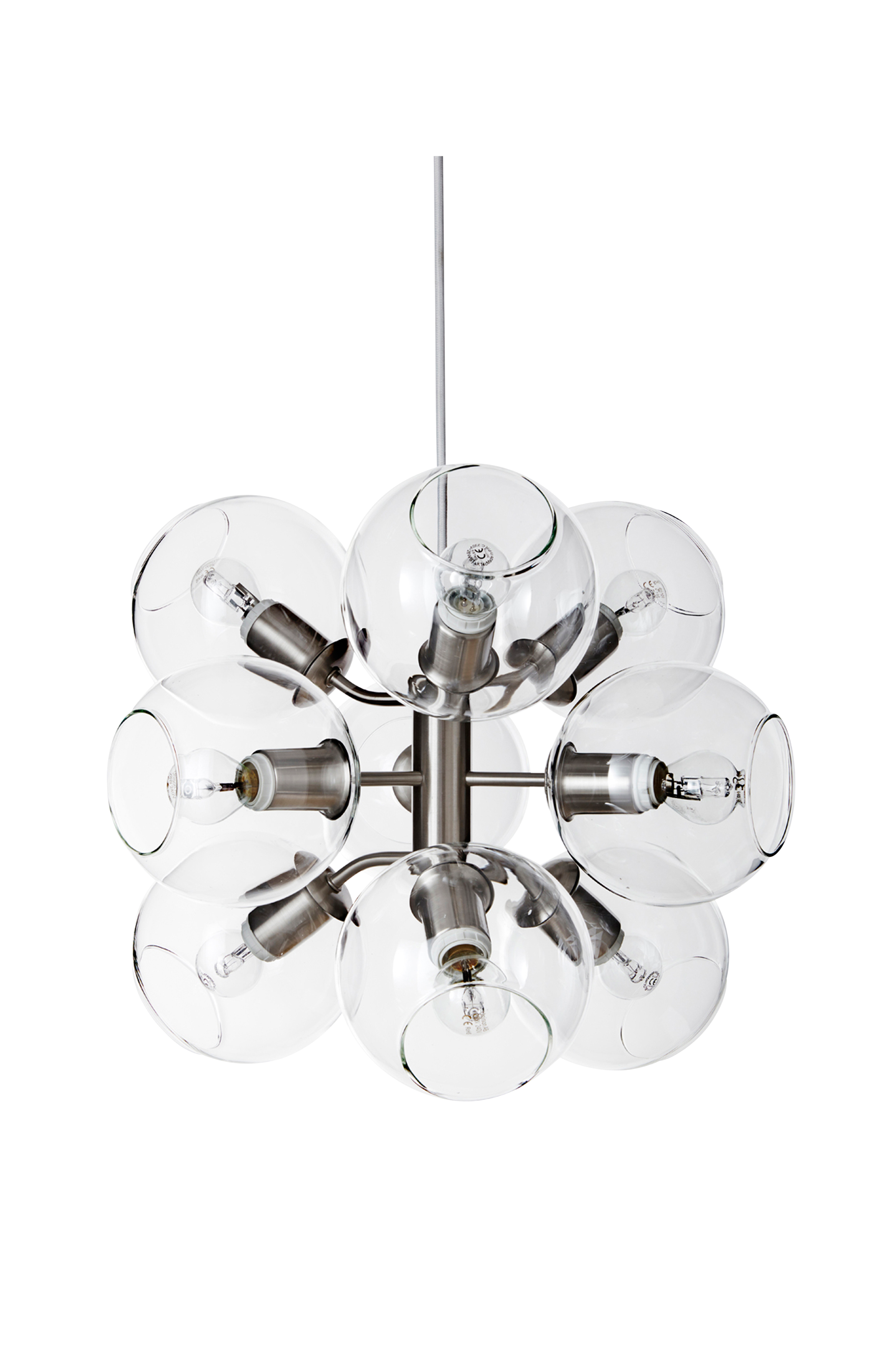 Tage 50 är en taklampa av metall med nio glaskupor. Lampan kan hängas högt upp i vardagsrumstaket eller i ett sovrum för att ge brett allmänljus, eller över ett matbord där den tar för sig och blir ett uttrycksfullt blickfång. Diameter 44cm, höjd 37cm. Vit textilsladd, 1,2meter. Ljuskällor och takkontakt ingår ej.