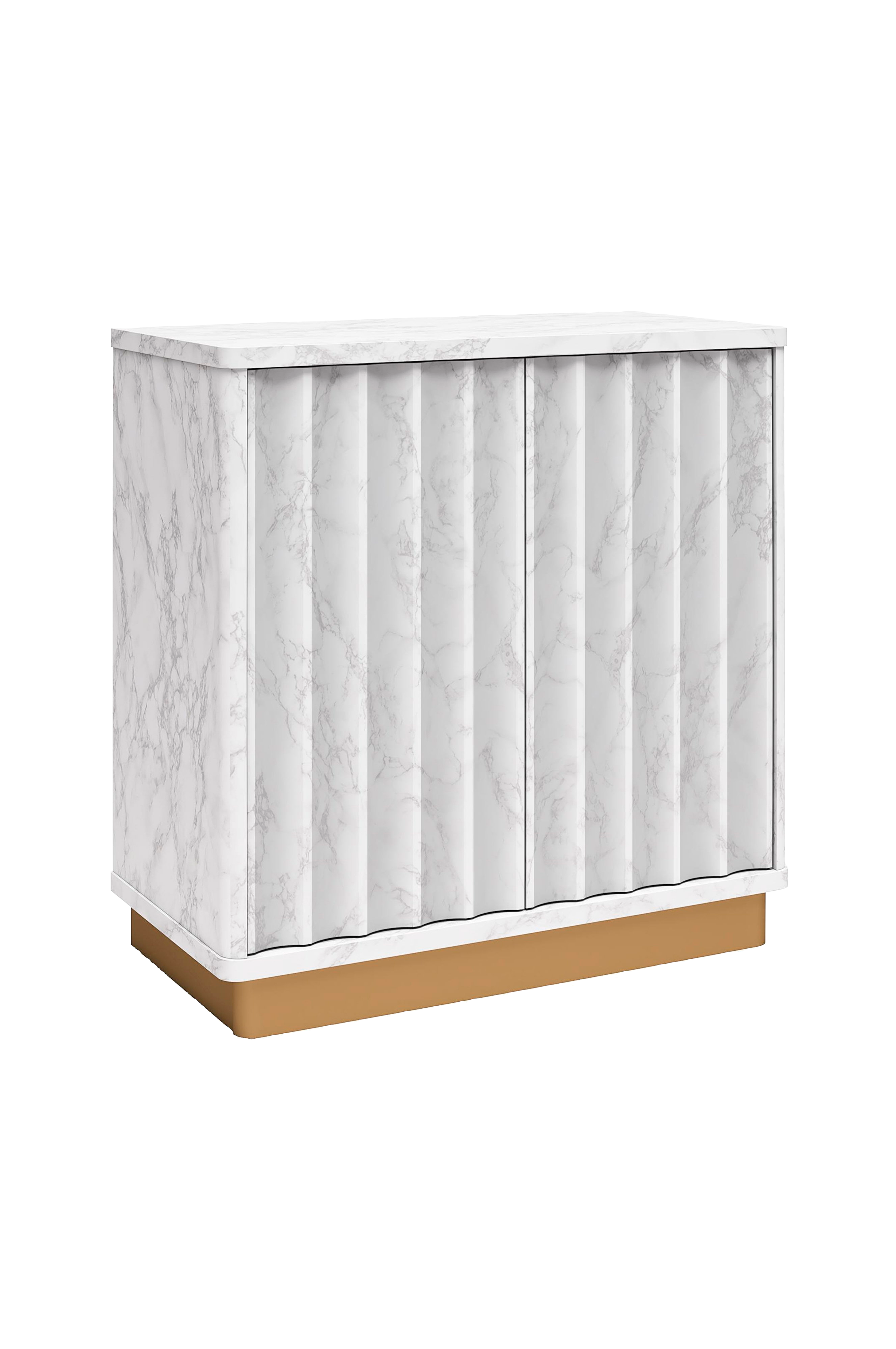 Cosmoliving by Cosmopolitan Cabinet erbjuder unika silhuetter och lockande linjer som passar perfekt för alla moderna utrymmen. Den har skålade detaljer, en gyllene bas och tidlösa designelement. Tillverkat av målad mdf, med skjutdörrar, justerbara hyllor och en blank yta av konstmarmor. Skåpet kräver montering och två vuxna rekommenderas för uppgiften.