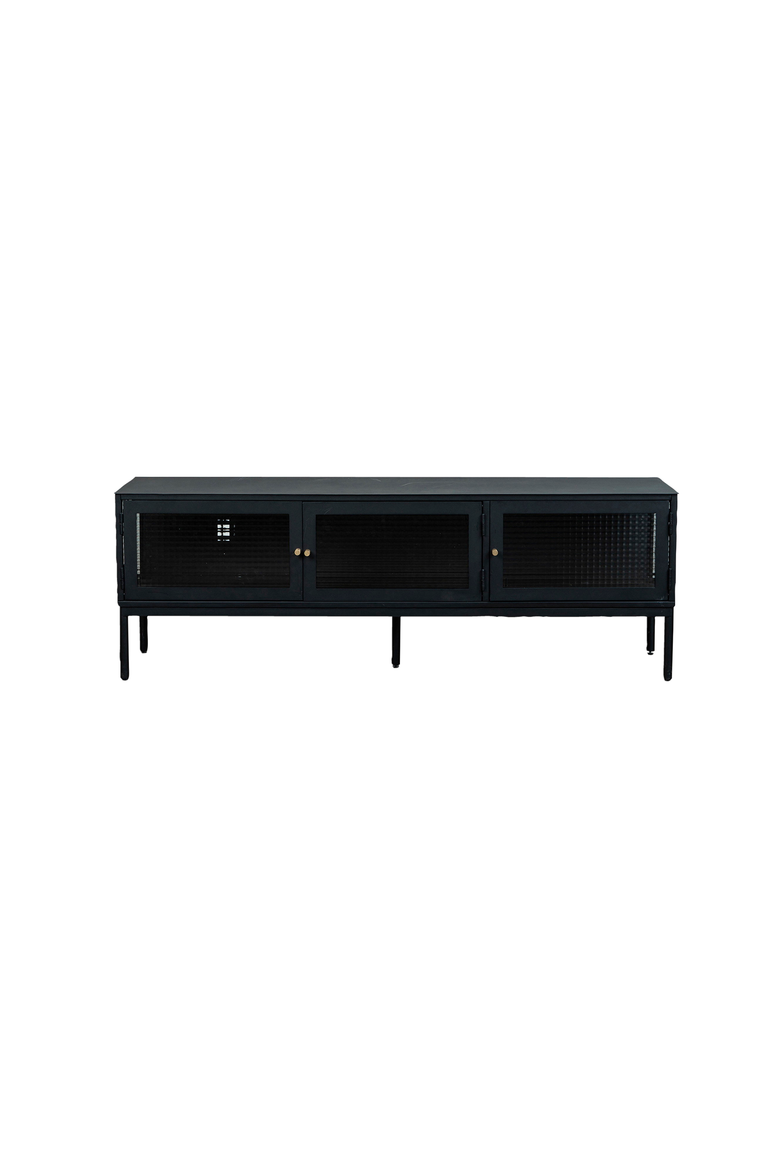 Ge ditt vardagsrum en modern touch med vår snygga tv-bänk. Med sin mörka finish och eleganta guldhandtag kombinerar den här möbeln både estetik och funktionalitet. De tre rymliga facken med glasdörrar och den öppna hyllan erbjuder gott om förvaringsutrymme för din elektronik och dina dekorativa föremål.
