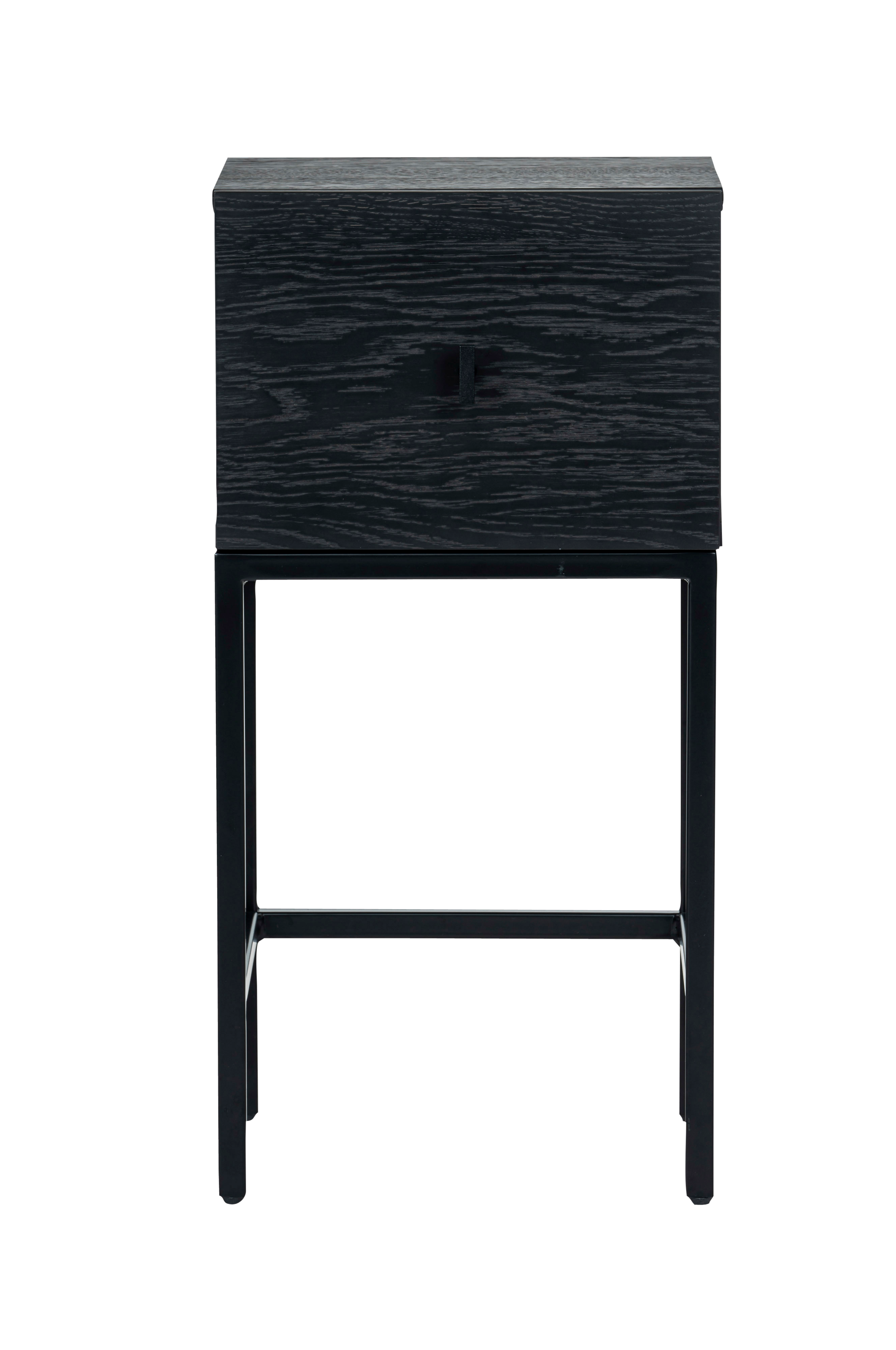 Stilrent och modernt sängbord med dold förvaring i låda. Svartlackerat underrede i metall möter ekfaner.