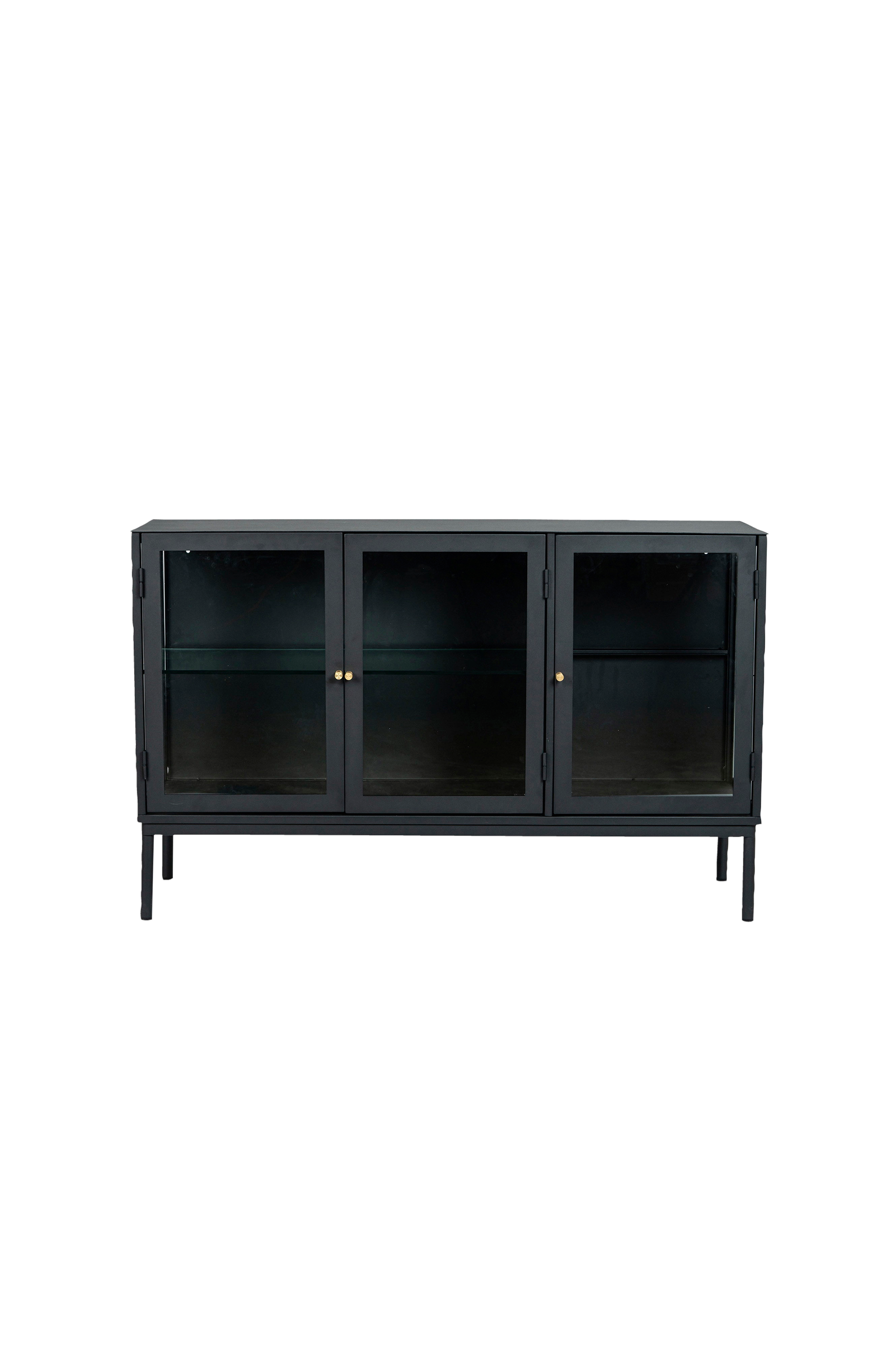 Förvandla ditt hem med detta snygga och eleganta svarta skåp. Med sina glasdörrar och gyllene handtag är det en perfekt kombination av modern design och funktionalitet. Skåpet har tre rymliga hyllor som ger gott om utrymme för förvaring av dina favoritsaker.
