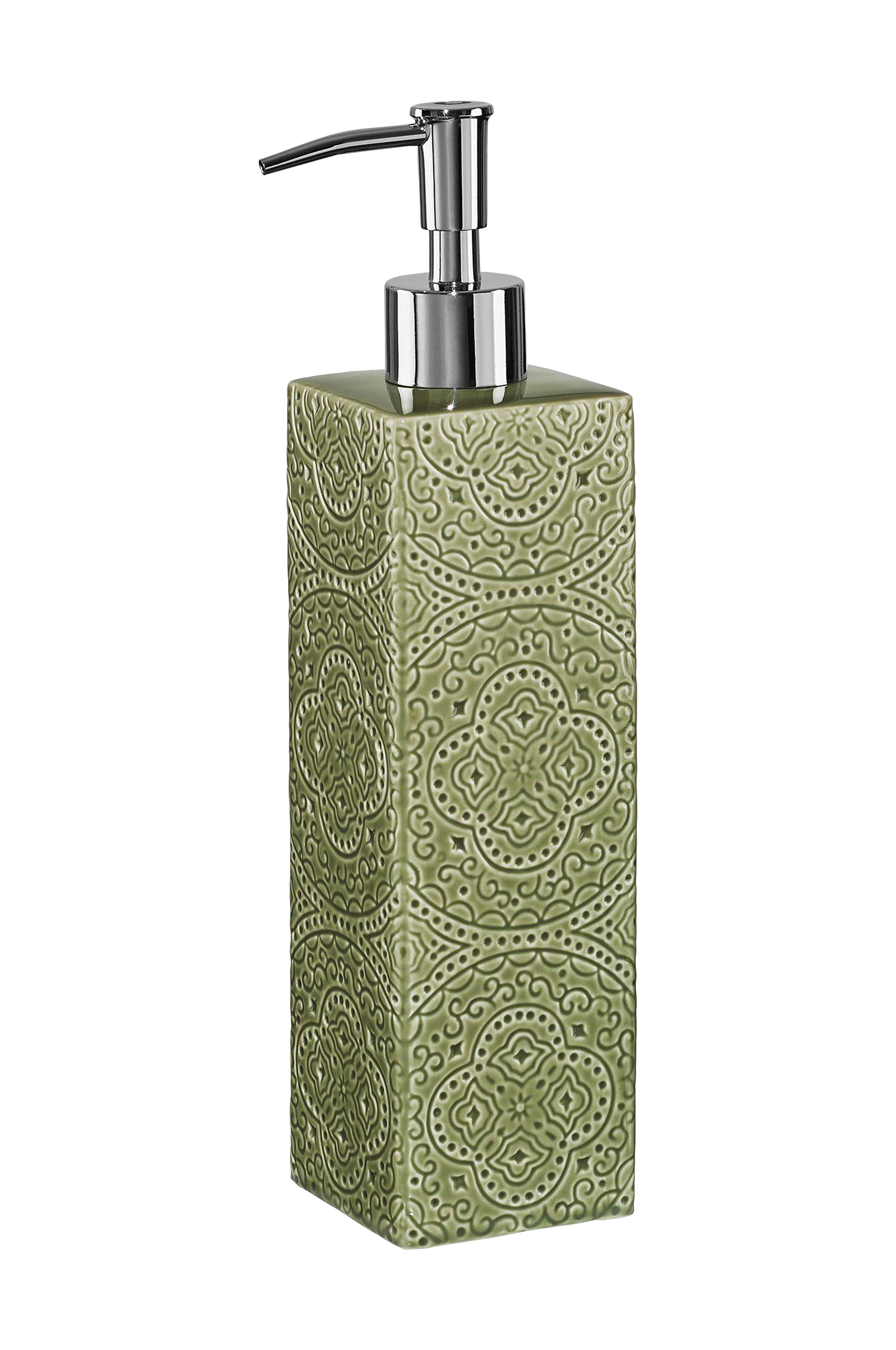 Tvålpump i keramik med vackert reliefmönster. Detta är ett dekorativt och funktionellt föremål designat av Marita Lord , känt för att skapa vardagsprodukter med fokus på keramiska material. Reliefmönstret ger en konstnärlig touch till den praktiska tvålpumpen.