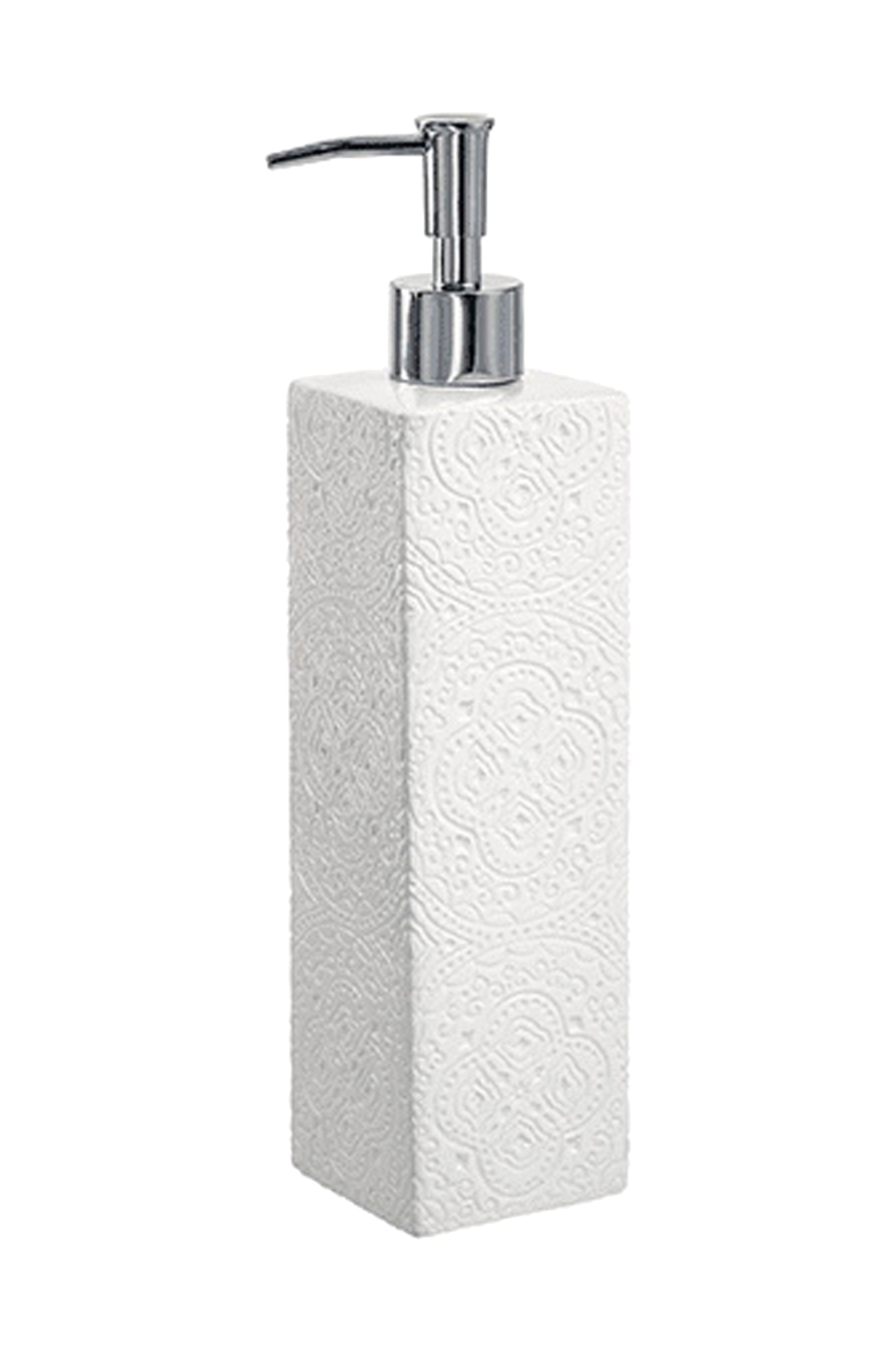 Tvålpump i keramik med vackert reliefmönster. Detta är ett dekorativt och funktionellt föremål designat av Marita Lord , känt för att skapa vardagsprodukter med fokus på keramiska material. Reliefmönstret ger en konstnärlig touch till den praktiska tvålpumpen.