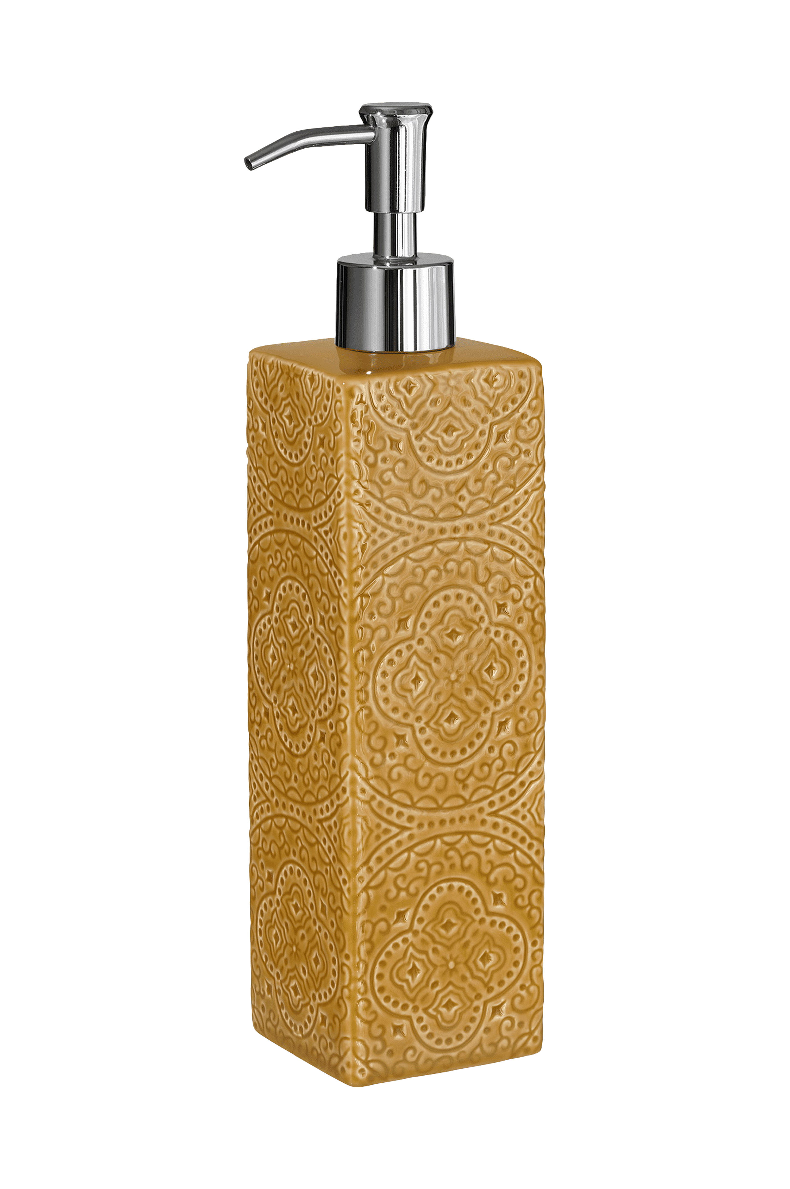 Tvålpump i keramik med vackert reliefmönster. Detta är ett dekorativt och funktionellt föremål designat av Marita Lord , känt för att skapa vardagsprodukter med fokus på keramiska material. Reliefmönstret ger en konstnärlig touch till den praktiska tvålpumpen.