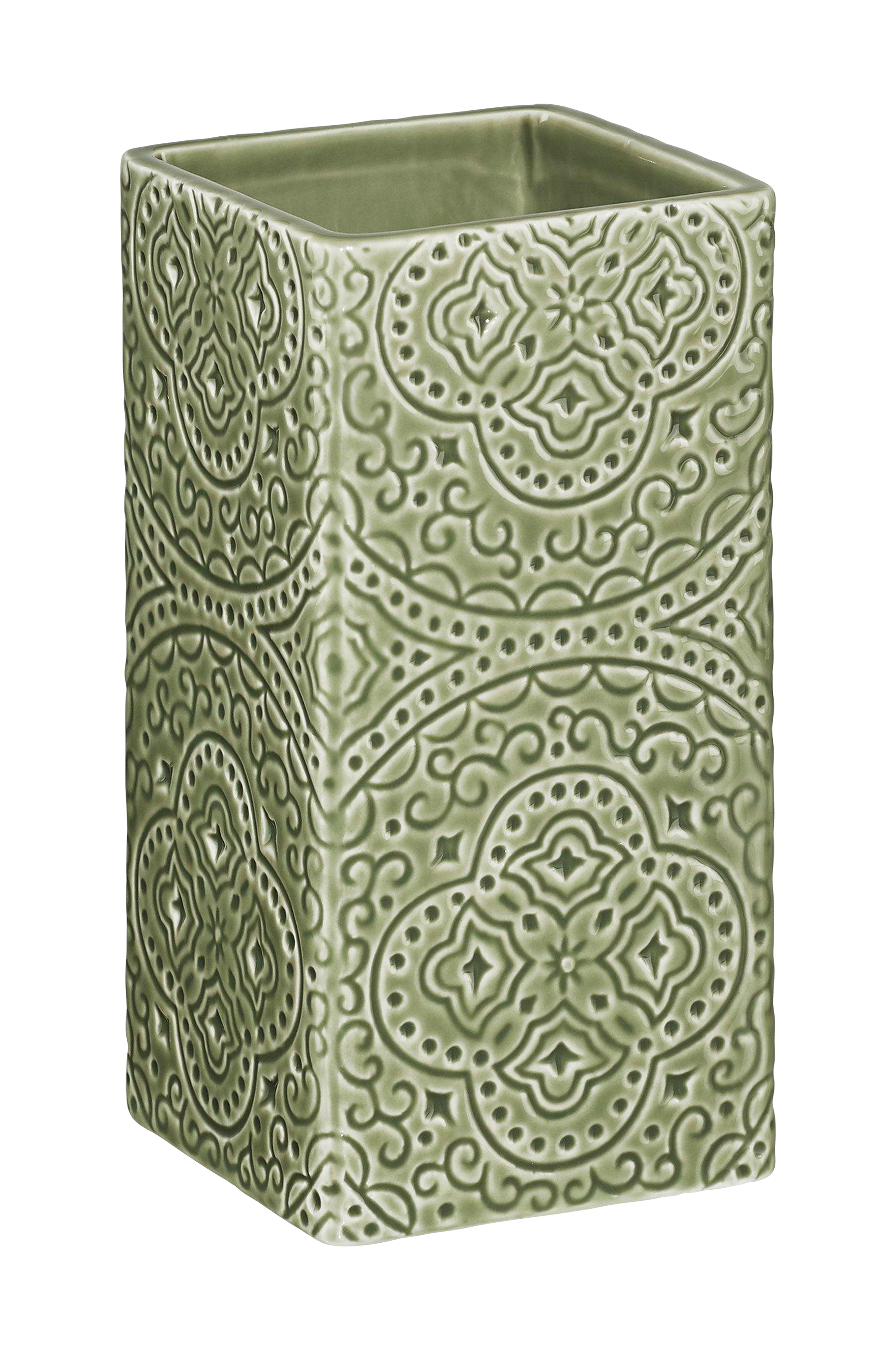 Tandborsthållare i keramik med reliefmönster som matchar tvålpumpen i samma serie. Den rymmer enkelt tandborste och tandkräm. Designad av marita lord