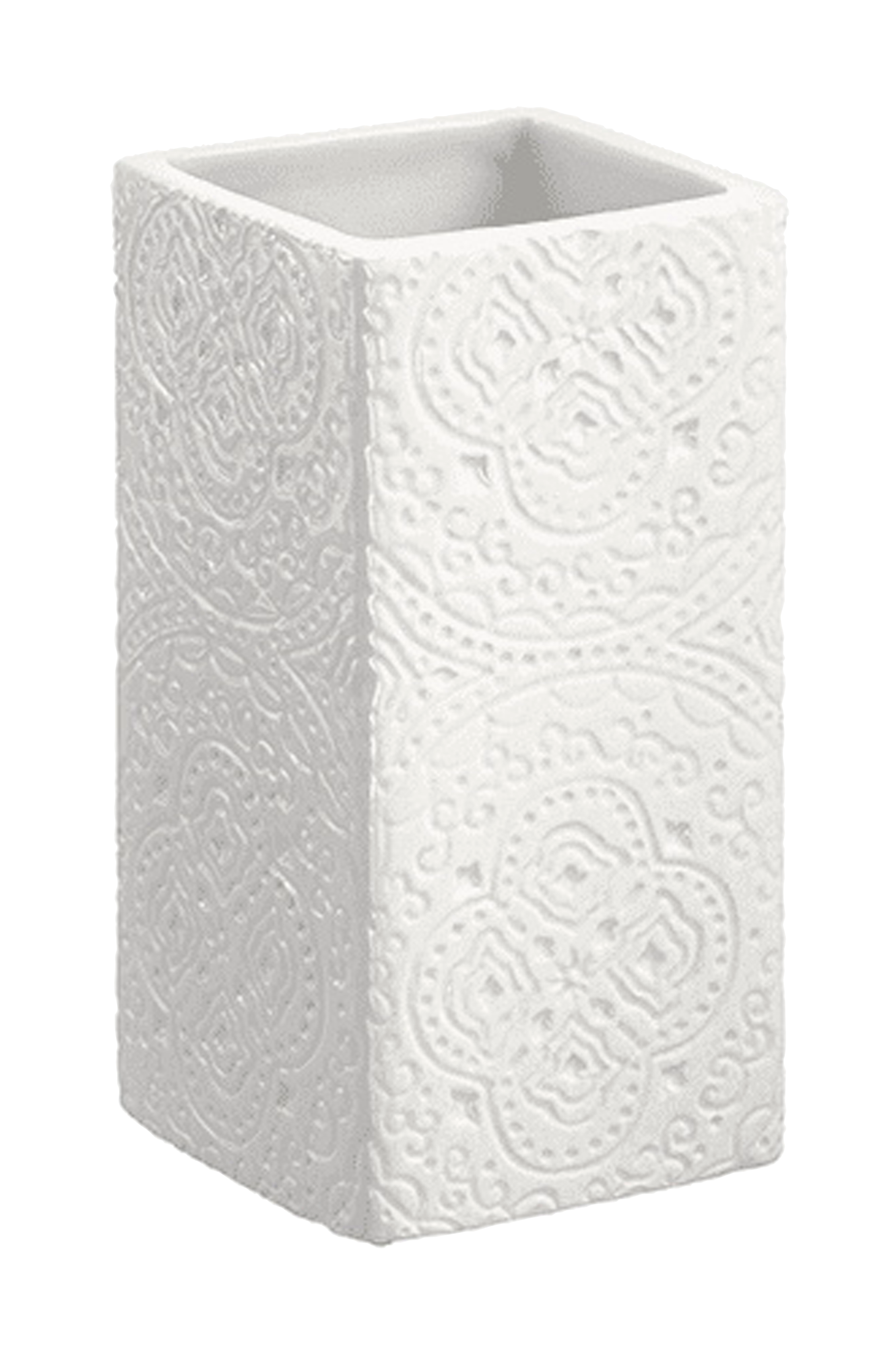 Tandborsthållare i keramik med reliefmönster som matchar tvålpumpen i samma serie. Den rymmer enkelt tandborste och tandkräm. Designad av marita lord