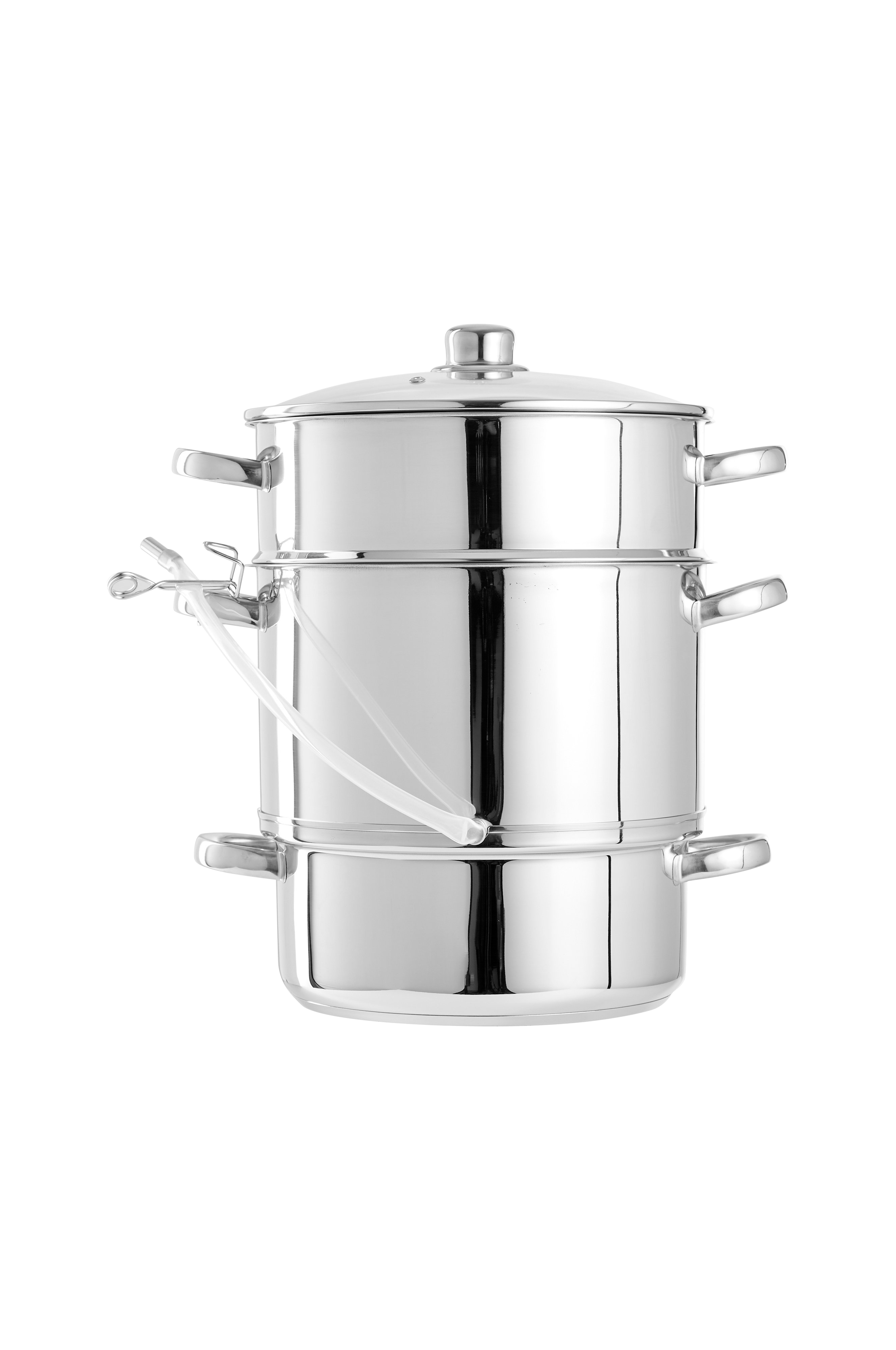 Det häftiga med att ha mycket frukt eller bär i trädgården är att man kan äta dem när man vill, och om det blir för mycket kan man använda den här ångsaftcentrifugen för att göra många saker, allt från lemonad till sylt. Den kommer i 3 delar med lock och ånghål. I mittdelen finns ett munstycke/utlopp som silikonslangen monteras på och sedan läggs i en flaska eller syltburk. Extraktorn levereras med en klämma för att stoppa flödet. Kan användas på alla värmekällor, inklusive induktion.