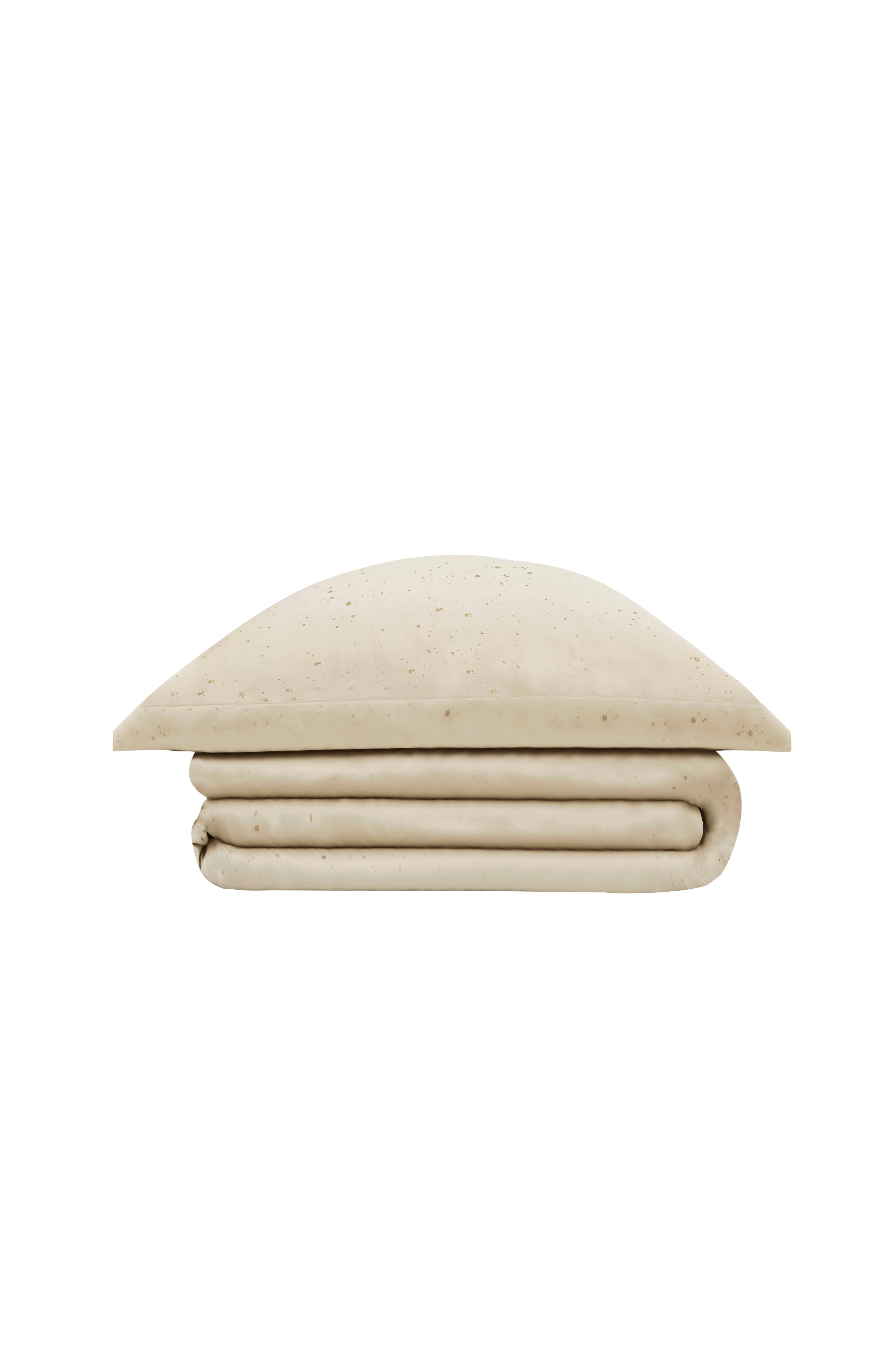 Det speciella, moderna och populära mönstret från DecoFlux kollektion Cosmos påminner om illusionen av universum. Hundratals guldfärgade prickar spelar på ytan av det mjuka tyget och skapar en harmonisk färgbalans. Bomullssatinen med långa fibrer och trådtäthet 300 TC kommer hålla länge och är skön att sova på.