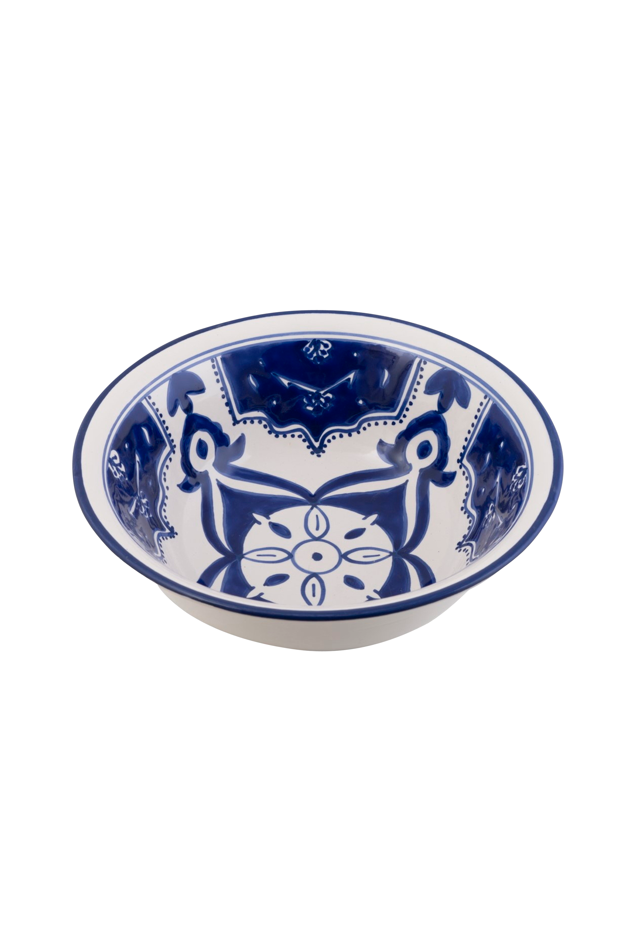 En skål i storleken ø 30 cm i det fantastiska mönstret blue fond som passar perfekt som salladsskål eller för servering. Dishes & deco produkter är handgjorda och handmålade i Tunisien och alla deras serveringsfat/skålar är tillverkade av tålig vit stengodslera. Tål ugn, mikrovågsugn och diskmaskin.