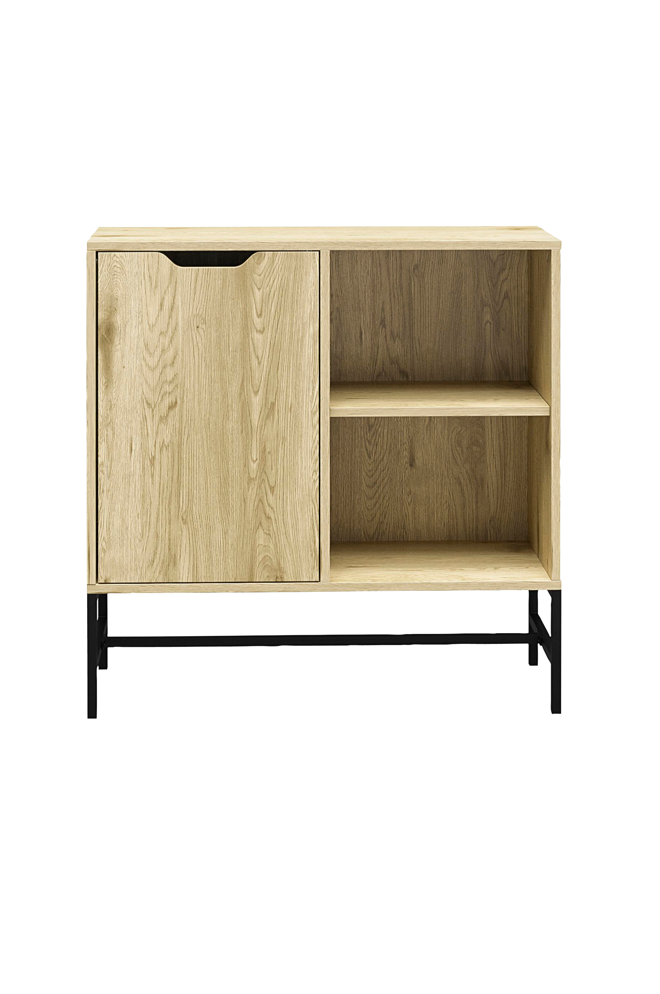 Bokhyllan Modine skapar en modern känsla. Varma trätoner, rena linjer och utskurna handtag gör den här bokhyllan till ett måste! Få det bästa av två världar med både öppen och dold förvaring. Organisera dina favoritböcker eller visa upp dina samlingar på de två hyllplanen och stoppa undan sådant som inte ska synas bakom skåpsdörren. Bokhyllan är tillverkat av hållbar MDF och stabil pulverlackerad metall, och levereras i ett platt paket. Mått efter montering: B76 x D30 x H76 cm. Vikt efter montering: ca 16 kg.