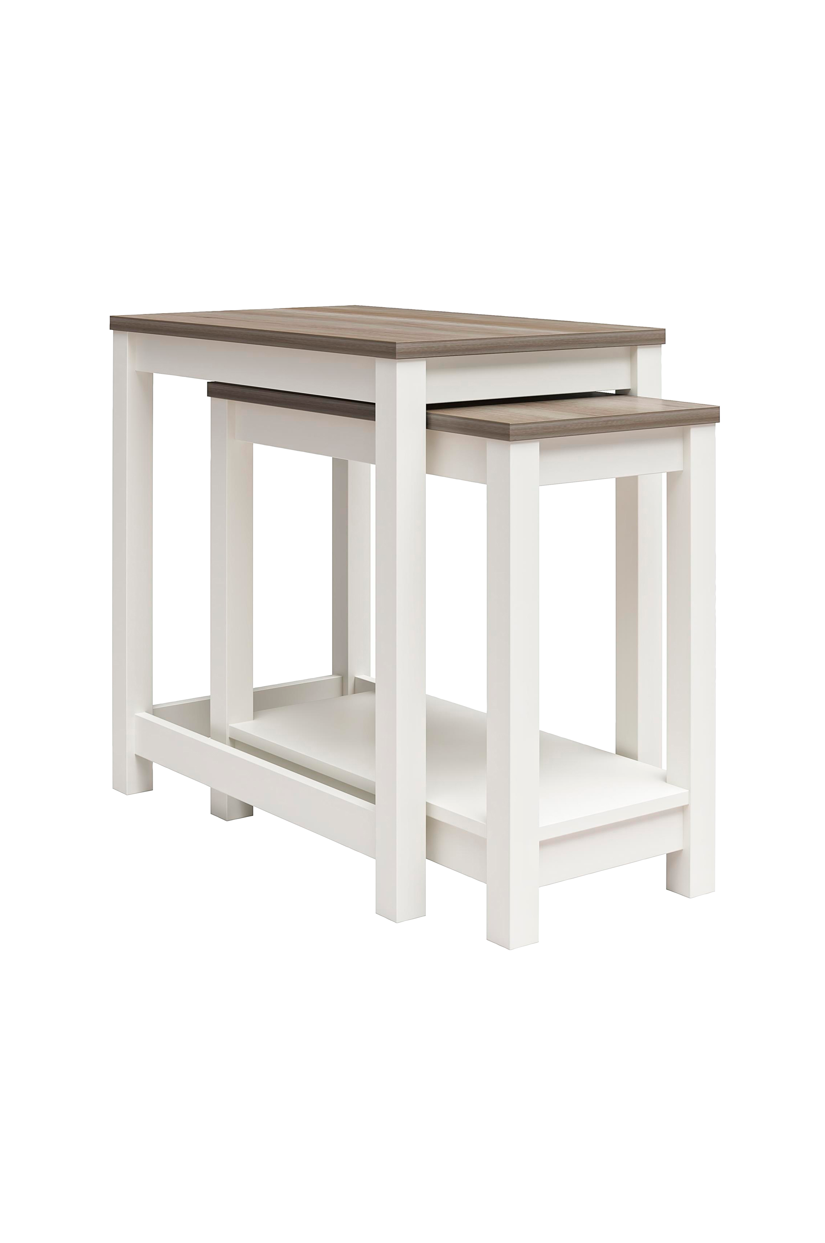 Detta 2-delade satsbord med sin rustika charm och sofistikerade tvåfärgade neutrala finish förhöjer ditt vardagsrum. Det mindre bordet är praktiskt utformat och har en praktisk förvaringshylla för böcker och tidningar. Dessa hållbara och eleganta bord är tillverkade av målad mdf och laminerad spånskiva och är byggda för att hålla länge. De erbjuder en smart platsbesparande lösning och levereras platta i en låda för enkel montering.