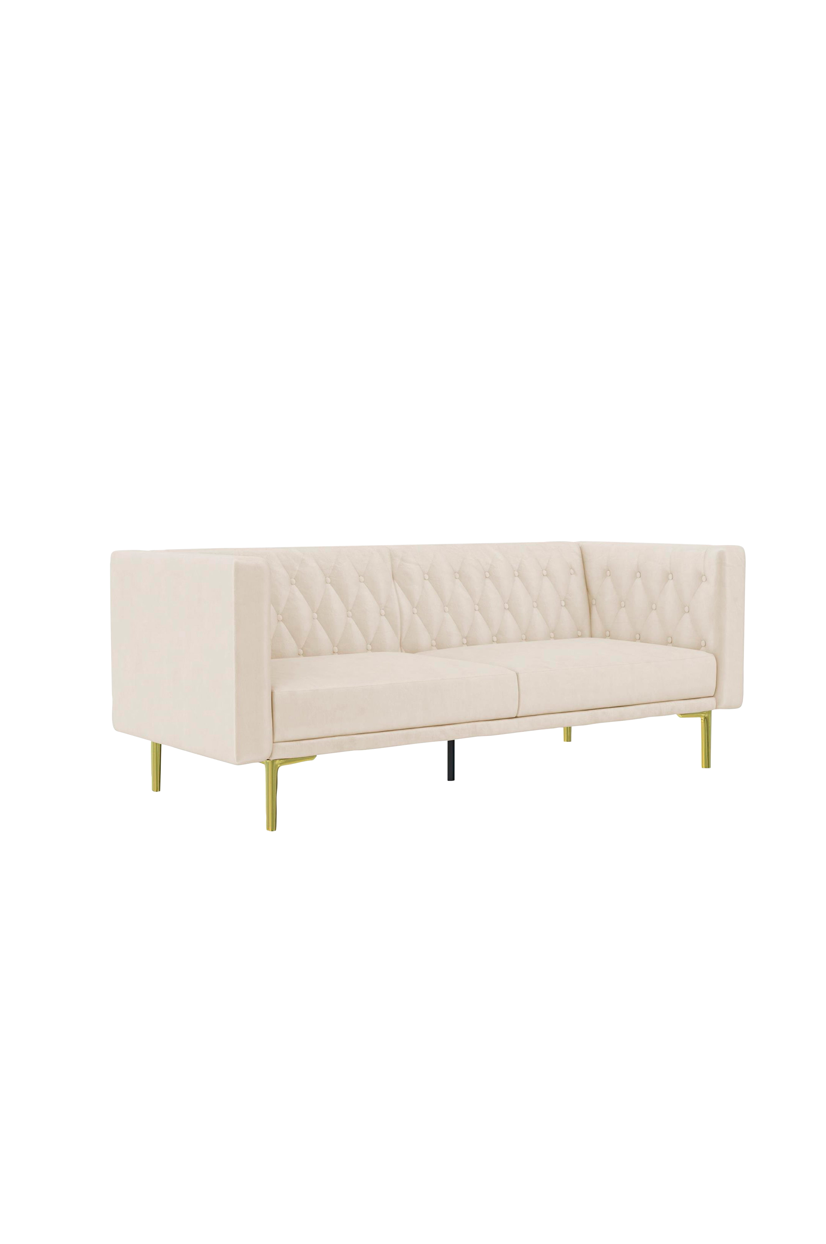 Lyxig 3-sitssoffa i modern stil. Med sammetsklädsel, djupa diamantknoppar på ryggstöd och armstöd och metallben i guldlook. Samtida 3-sitsig soffa med plats för 3 gäster, den lilla soffan passar i alla storlekar av vardagsrum. Den är vadderad med skyddade armar och rygg samt sittdynor i högdensitetsskum för en önskad medium fasthetskänsla. Soffan är tillverkad med solida konstruktionsprinciper och har en robust plywoodram, en nosag-rygg med spiralfjädrar och metallben i stål. Alla delar, verktyg och instruktioner ingår i lådan för montering på 30 minuter. Lätt att rengöra och kan torkas av från fläckar med en lätt fuktad trasa.