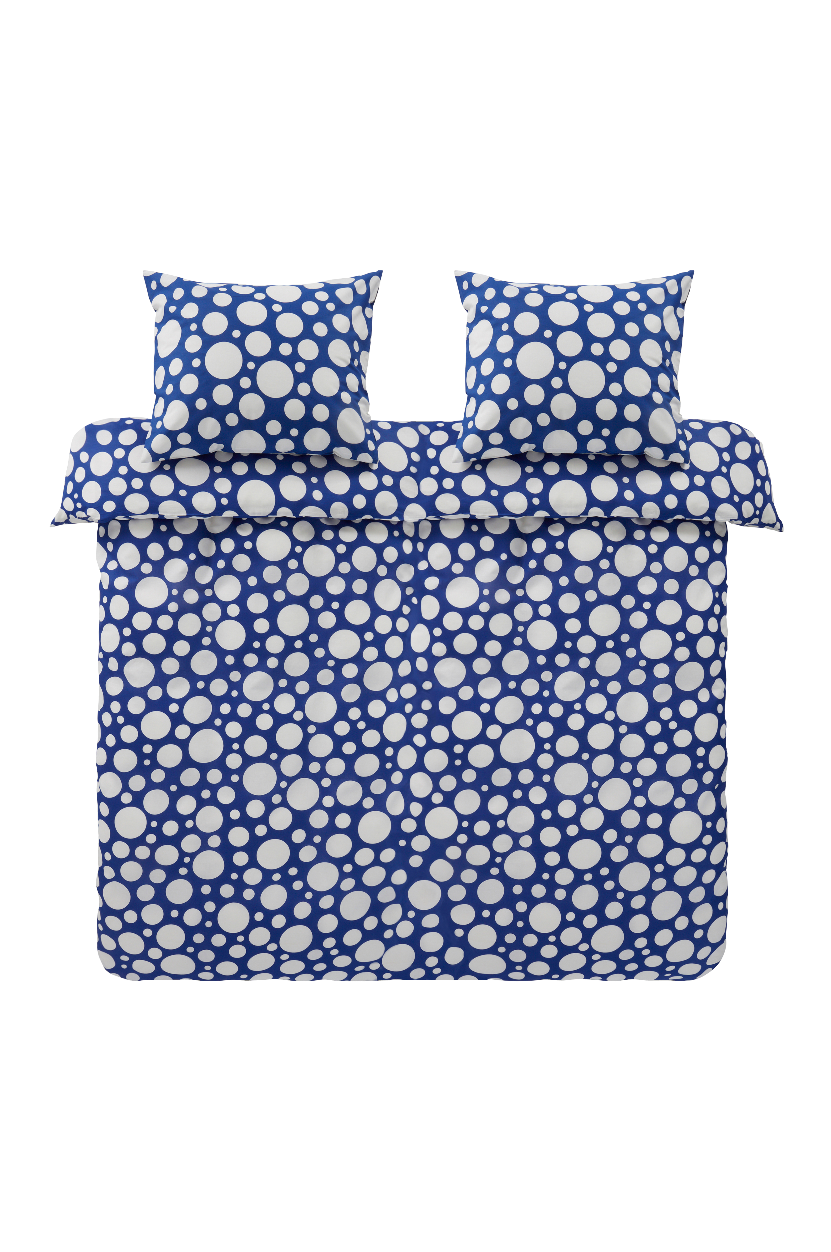 Påslakanset i tre delar med ett extra brett påslakan och två örngott i skön bomull med tryckta, vita prickar. Bomull är en sval och fräsch kvalité som känns behaglig mot huden. Öppning i övre hörnen på påslakanet, som underlättar att trä påslakanet över täcket. Trådtäthet på 144 tc. (Trådtätheten talar om antalet trådar, thread counts, per kvadrattum i ett tyg. Ju högre trådtäthet desto högre kvalité.)