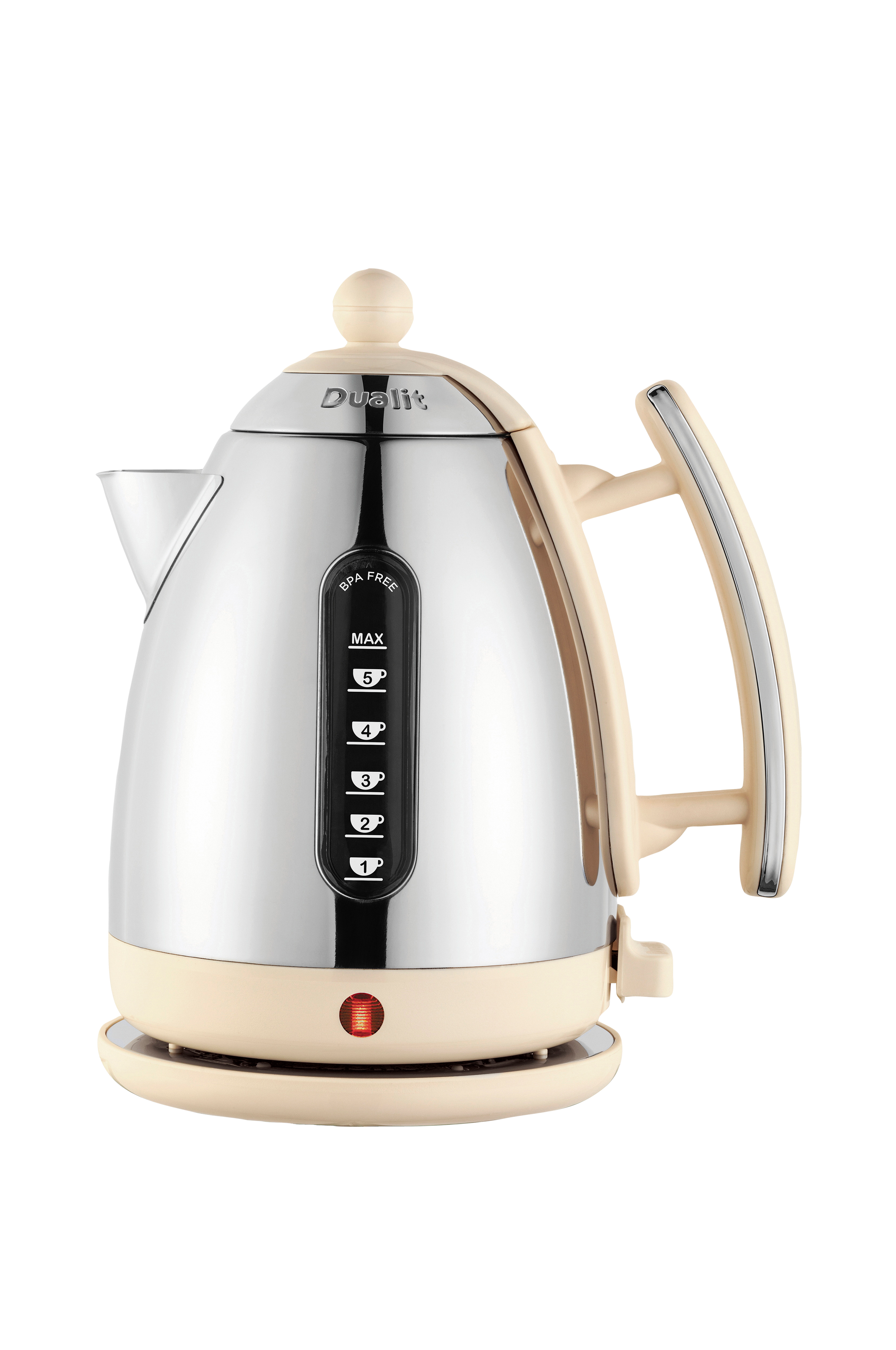 Mindre vattenkokare i modern design med bekvämt ergonomiska handtag och praktiskt, sladdlös kanna.