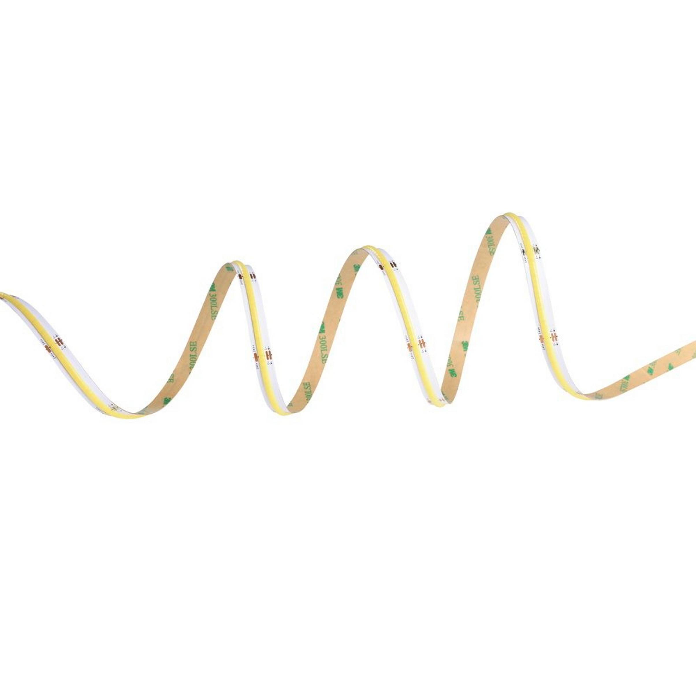 Den flexibla cob stripen med en längd på 5 m är tillverkad av vit plast och utrustad med integrerade lysdioder som ger ett justerbart behagligt ljus. Med den medföljande fjärrkontrollen kan du välja mellan varmvitt, neutralvitt och kallvitt ljus samt dimra ljuset. Tejpen är idealisk för indirekt och dekorativ belysning av olika föremål och rum i hemmet. Du kan t.ex. indirekt belysa garderoben, väggen, sängkanten, pentryt eller vardagsrummet. På grund av de små avstånden mellan lysdioderna syns inga ljuspunkter. Led-tejpen kan kortas av var 5:e cm vid de avsedda markeringarna med en sax och kan fästas snabbt och enkelt tack vare den integrerade självhäftande remsan.