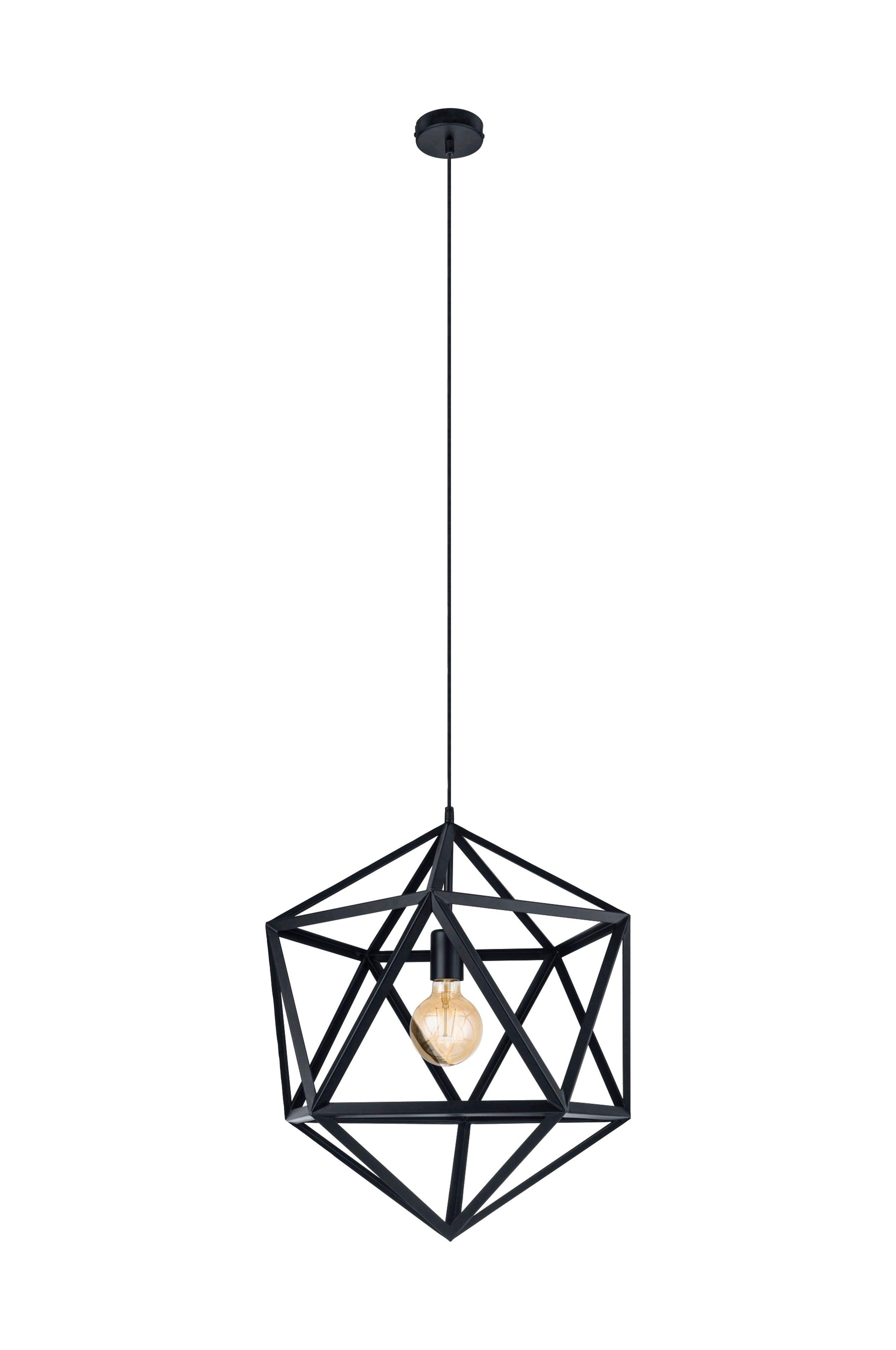 Pendellampan embleton har en svart diamantformad lampskärm i metall och ett synligt glödlampsuttag. Lampskärmens metallramverk skapar ett fascinerande spel av ljus och skugga när lampan är tänd. Pendellampan smälter sömlöst in i interiörer i den trendiga industristilen. Den ger en distinkt belysning till ditt hem, oavsett om det är i vardagsrummet eller ovanför bordet i matsalen. Produkten har en e27-lamphållare och kräver 1 x e27-glödlampa, som inte ingår.