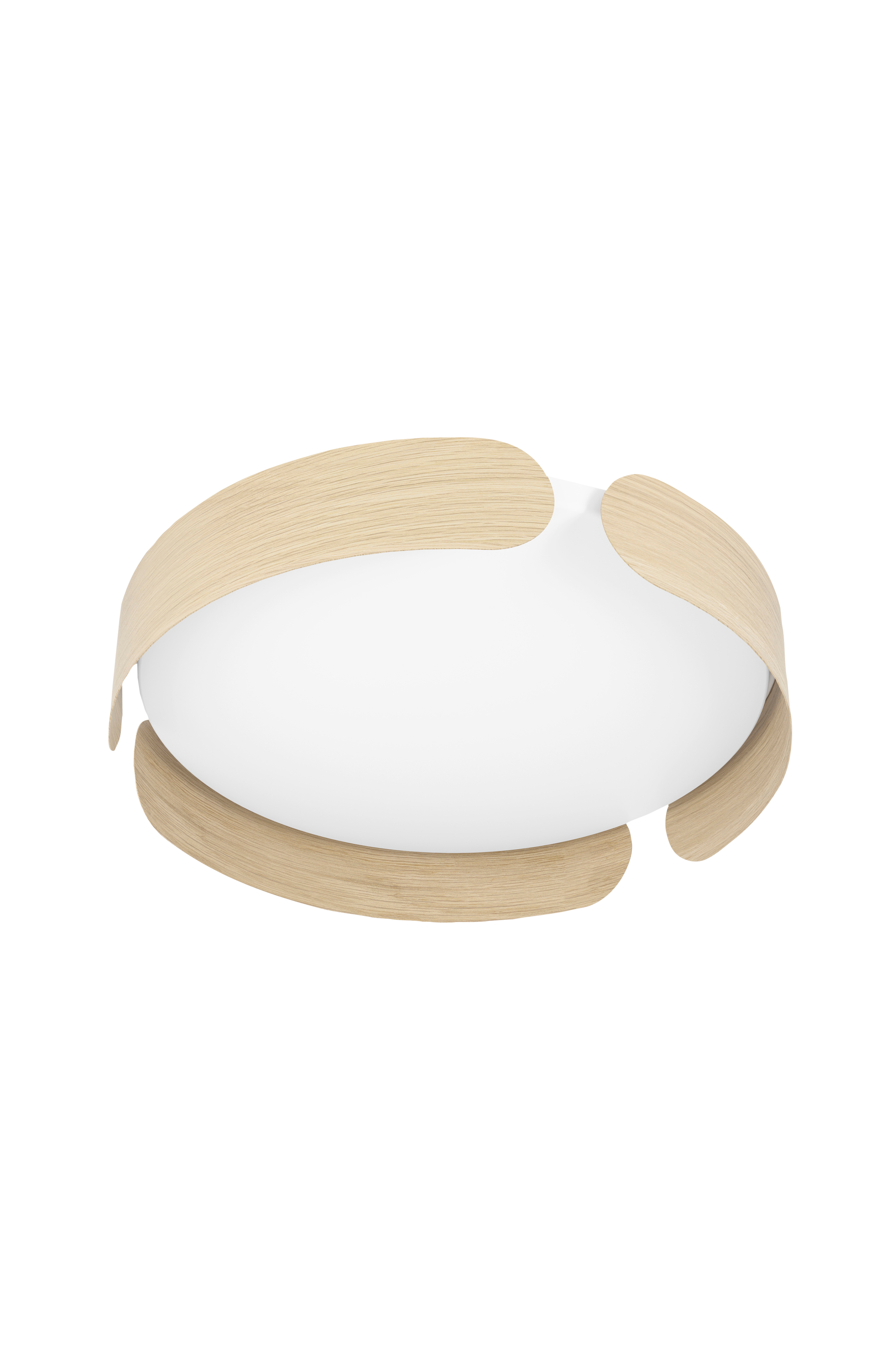 Taklampan valcasotto har ett runt vitt led-ljuselement och en dekorativ ram av tre svarta metallelement, tre ekfanérelement eller tre moccafärgade metallelement. Tack vare sin form och sitt plasthölje ger taklampan en jämn varmvit belysning. Taklampan passar utmärkt in i moderna och minimalistiska inredningar och ger en mysig belysning i alla utrymmen, oavsett om det är i vardagsrummet, sovrummet, hallen eller matsalen.