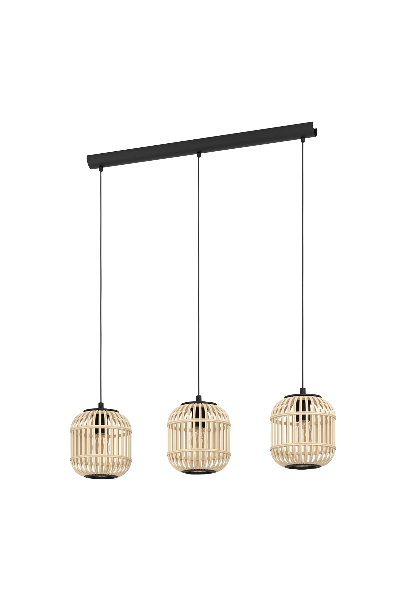 Pendellampan bordesley har tre lampskärmar tillverkade av naturlig bambu och ett långt svart metallfäste. Lampskärmarna skapar ett fascinerande ljus- och skuggspel så snart lampan tänds. Pendellampan smälter sömlöst in with den aktuella "natur"-trenden och skapar en tilltalande atmosfär with sina naturliga material. Den ger en distinkt belysning för alla utrymmen, oavsett om det är i vardagsrummet eller ovanför bordet i matsalen. Produkten kräver 3 x e27-glödlampor som inte ingår.