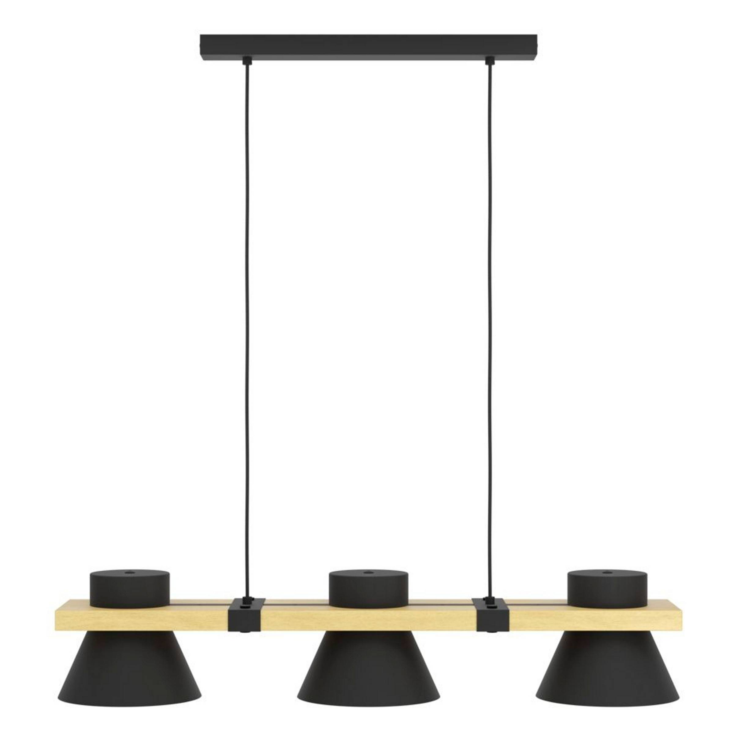 Pendellampan maccles har tre svarta lampskärmar i stål som är fästa på en träplatta. Träplattan är upphängd i ett svart ståltak med matchande träklämmor som understryker pendellampans industriella karaktär. Pendellampans trendiga mix av metall och naturmaterial passar perfekt in i moderna inredningsstilar och ger en iögonfallande belysning i vardagsrummet eller ovanför matsalsbordet. Armaturen har e27-lamphållare och kräver 3 x e27-glödlampor, som inte ingår.