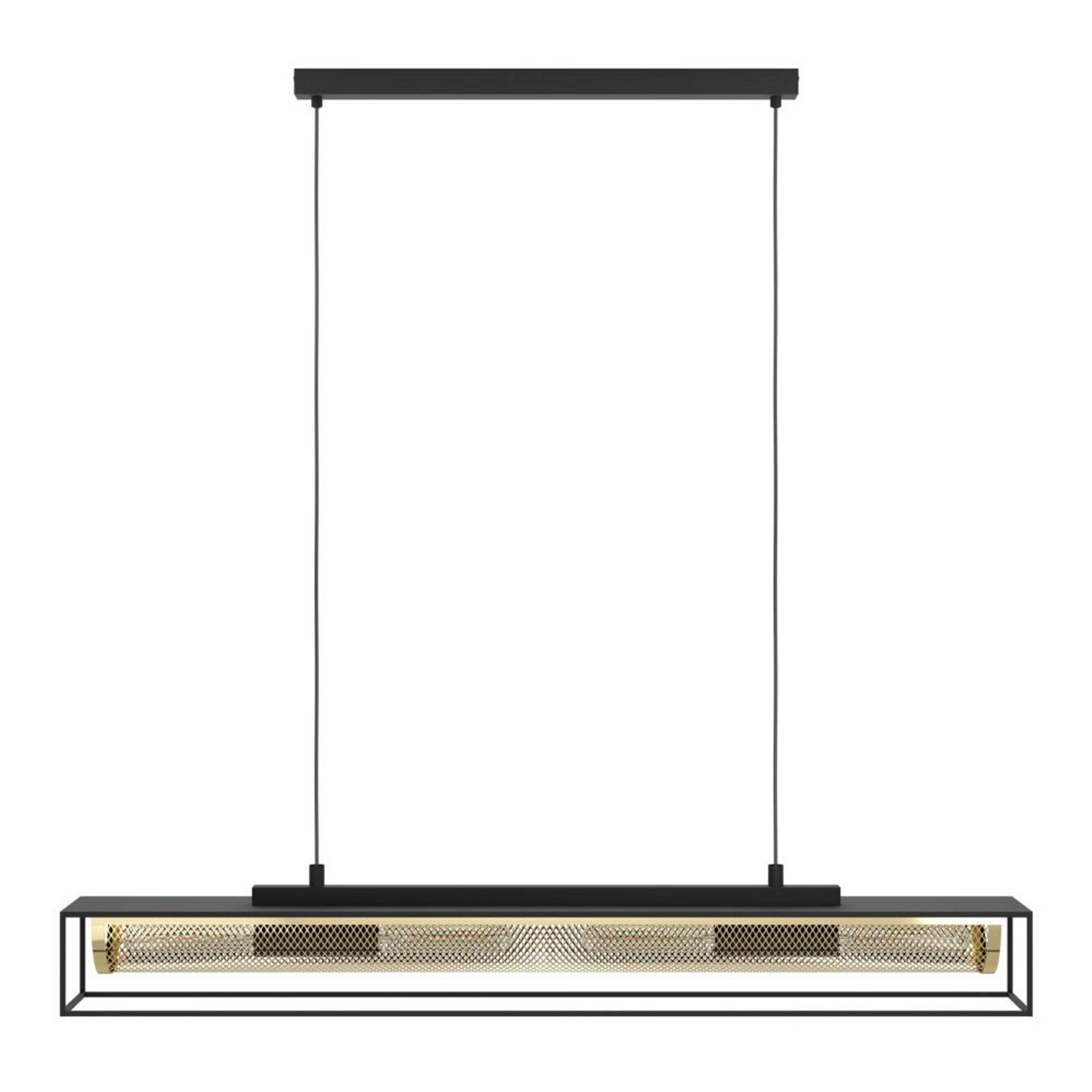 Pendellampan nohales har en långsträckt, svart metallram som inrymmer ett industriinspirerat metallnät med mässingsfinish. Tack vare den halvsynliga glödlampan skapar produkten ett fascinerande mönster av ljus och skugga när den tänds. Med sin industriella look smälter den hängande pendellampan sömlöst in i en mängd olika inredningsstilar och erbjuder elegant belysning ovanför matsalsbordet eller köksön. De avbildade glödlamporna ingår inte. Produkten har e27-lamphållare och kräver 4 x e27-glödlampor, som inte ingår.