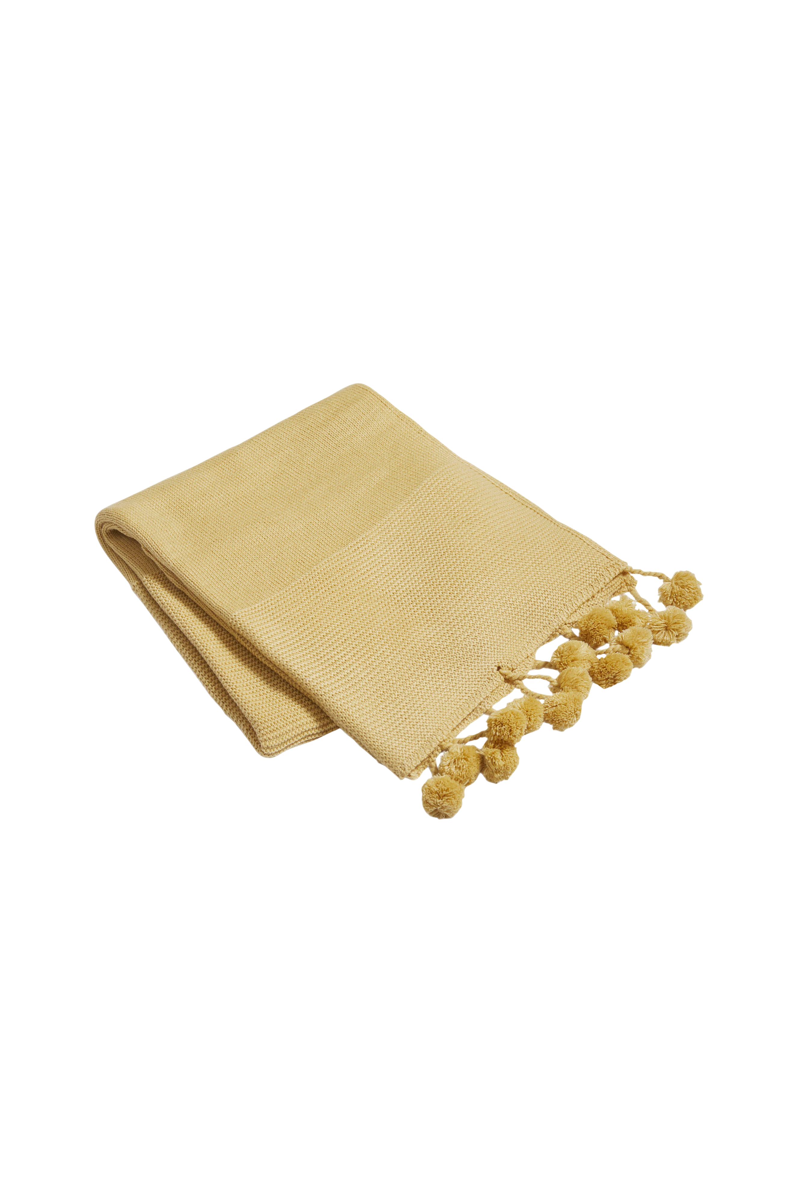 Stickad pläd med dekorativa bollar på kortsidorna, l150xw130cm. 100% akryl, handtvätt.
