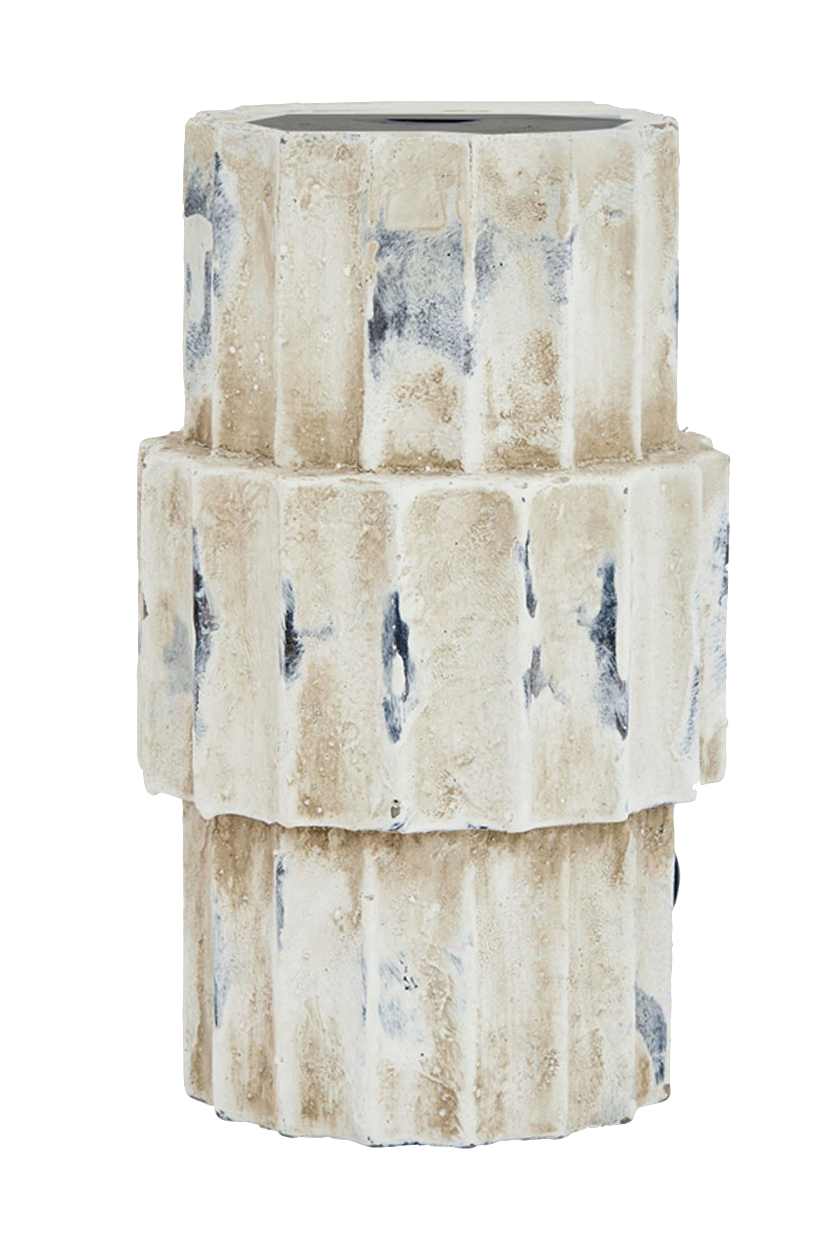 Vas med randigt mönster i cement, höjd 23cm. Torkas av med en fuktig trasa. Varje föremål är handgjort och unikt. Lergods är ett naturligt poröst material och kan läcka, använd gärna med en bricka eller placera på vattentäta ytor.