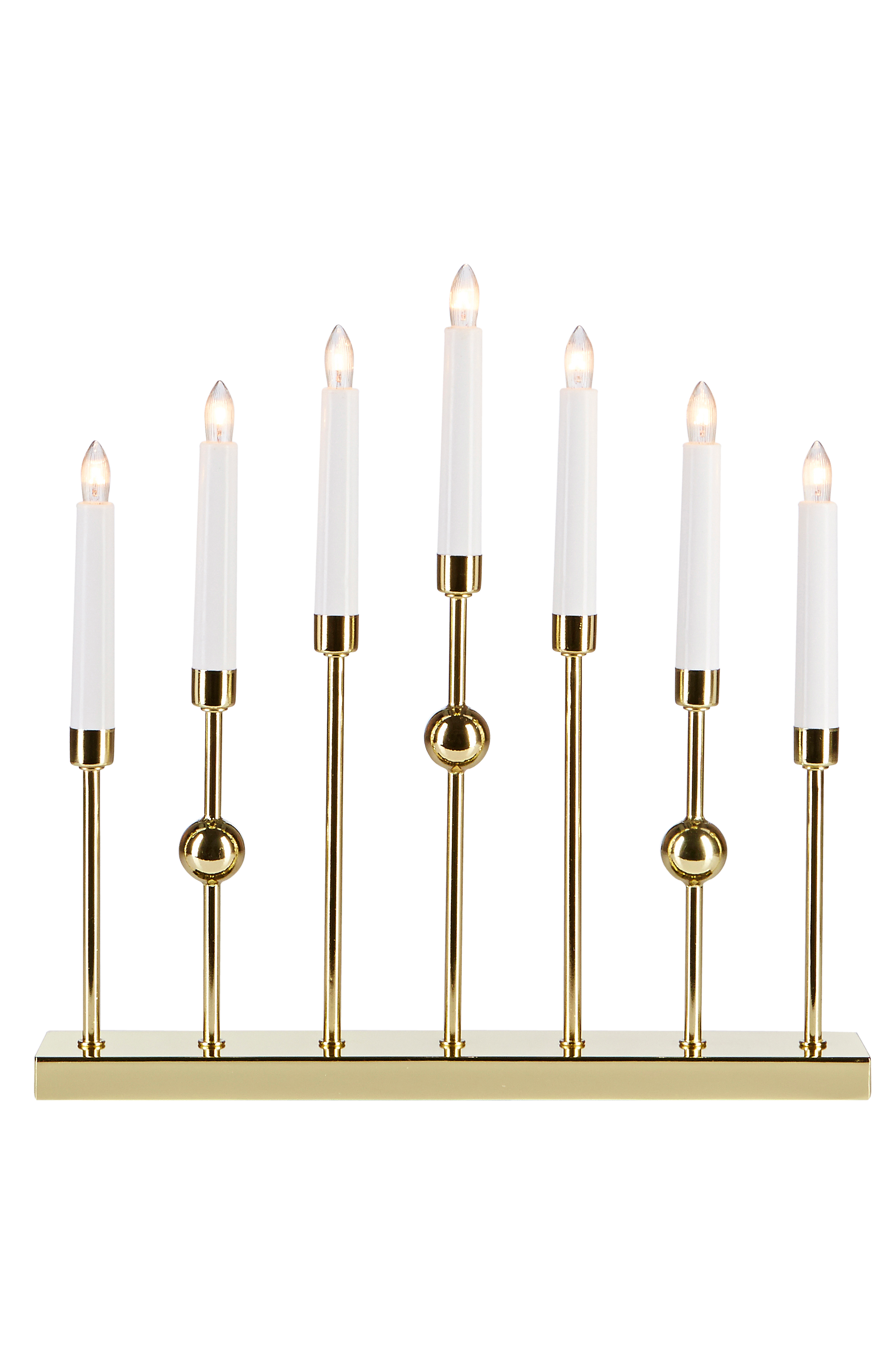 av metall med 7 ljus. Höjd 37 cm. Bredd 37 cm. Djup 6 cm. Sladdlängd 1,8 m med strömbrytare. E10 (lampor ingår).