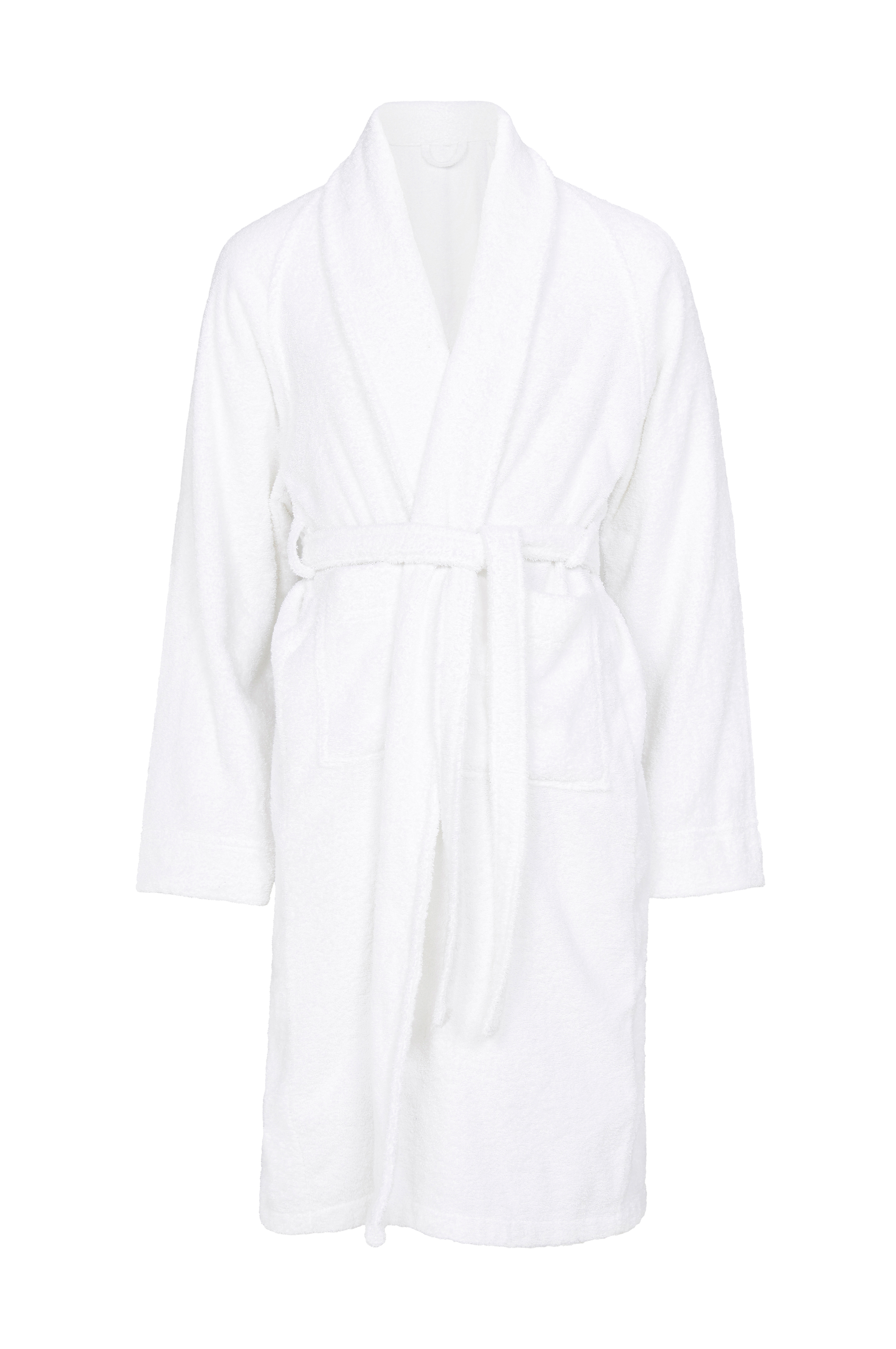 Badrock av 100% bomullsfrotté med krage, två fickor och knytskärp. Längd 120 cm i stl 38/40.