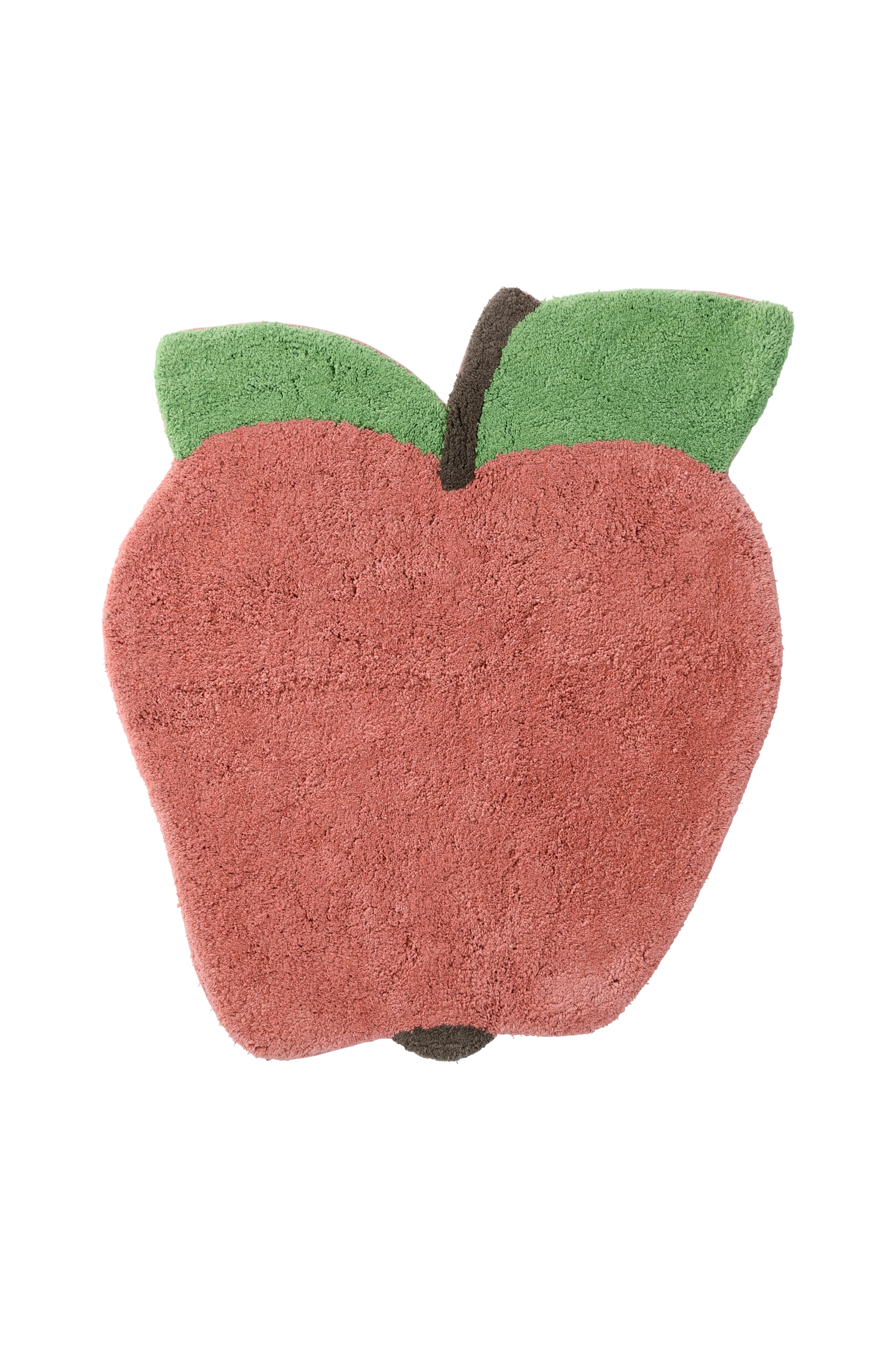 Tuftad, mjuk badrumsmatta i form av ett äpple. Av bomull. Halkfri baksida med latexbehandling.