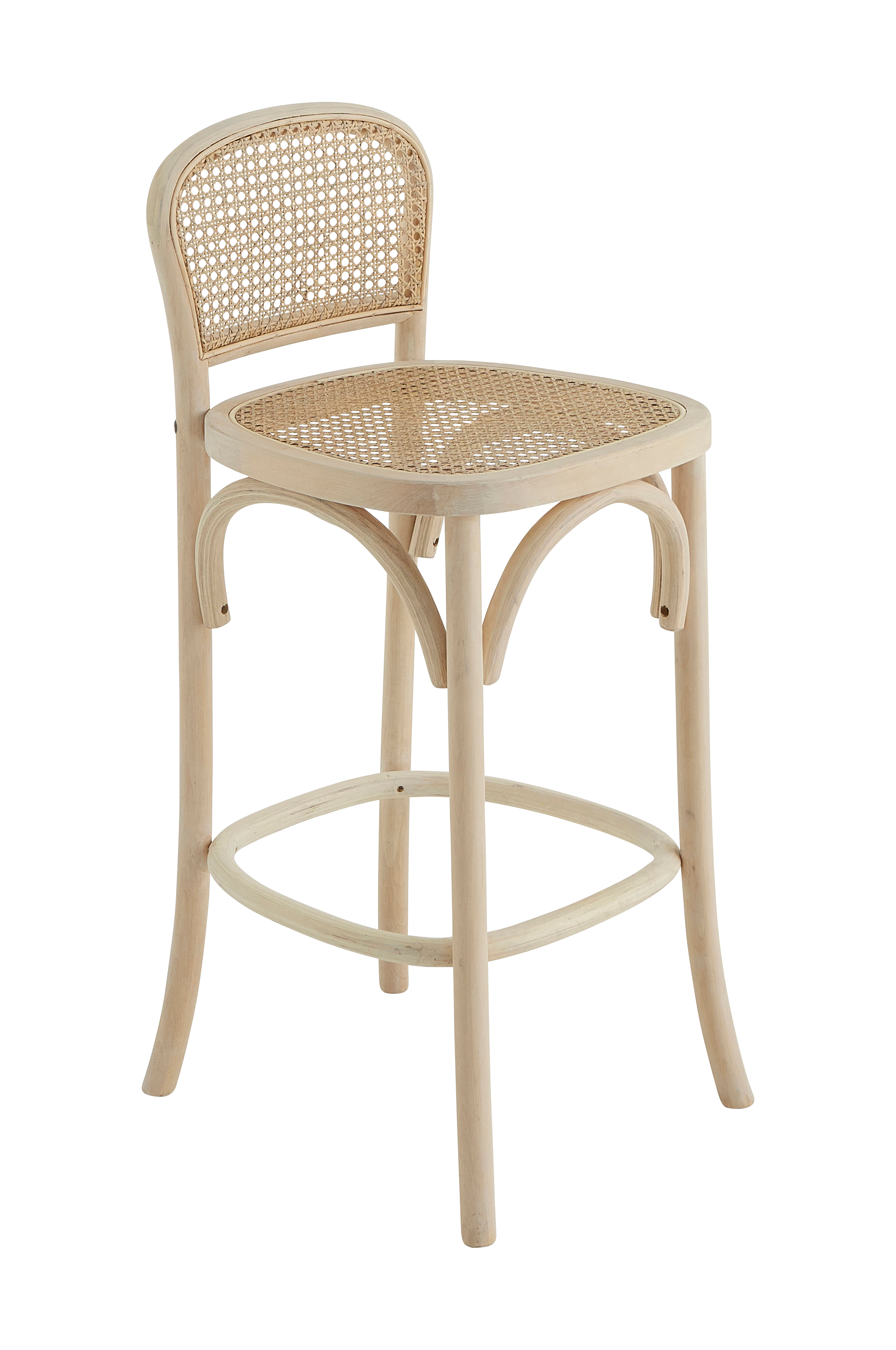 Barstol i björk med rygg och sits av rotting. Höjd 91, djup 42, bredd 40 cm. Sitthöjd 67 och sittdjup 39 cm. Monterad. Max vikt 90kg.