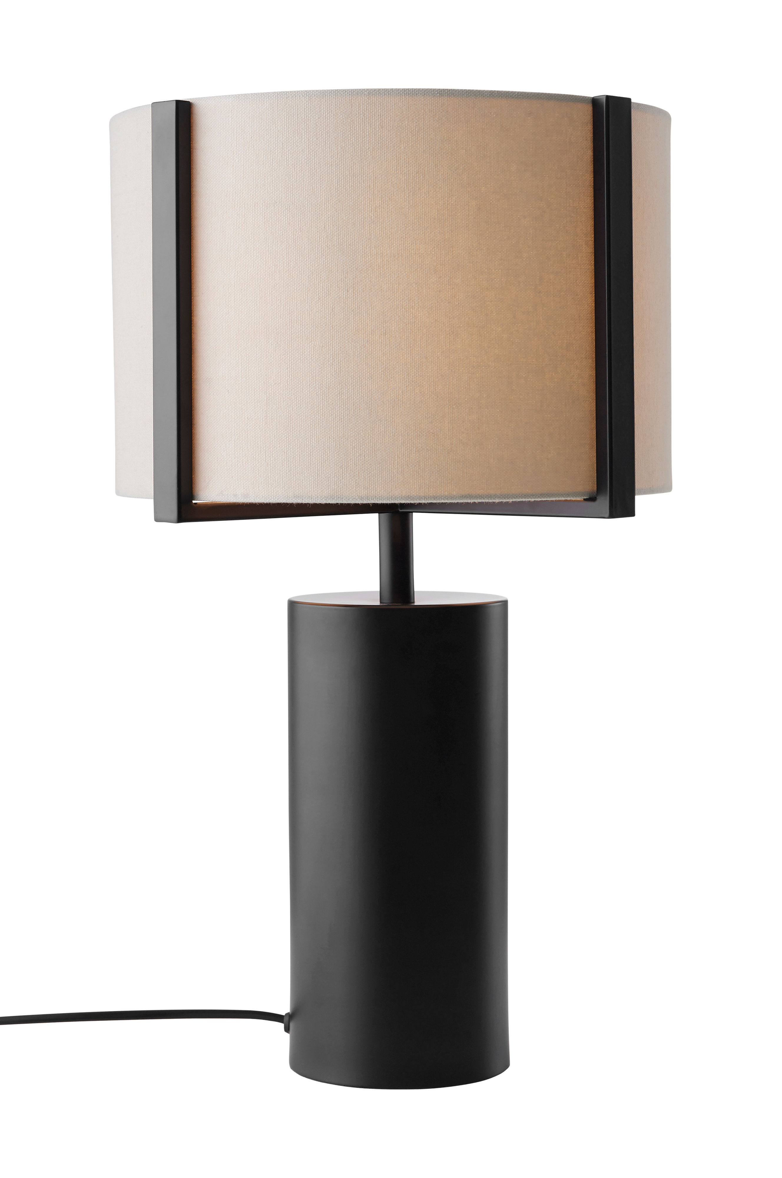 Bordslampa med fot och skärmhållare av metall med matt finish. Skärm av tyg med grövre struktur. Total höjd 50 cm. Skärmens mått: Ø 30 cm höjd 20 cm. Lampfotens mått: Ø 12 cm, höjd 25 cm. Svart sladd med strömbrytare, sladdlängd 200 cm. Sockel E27. Max 40W. Ljuskälla ingår ej.