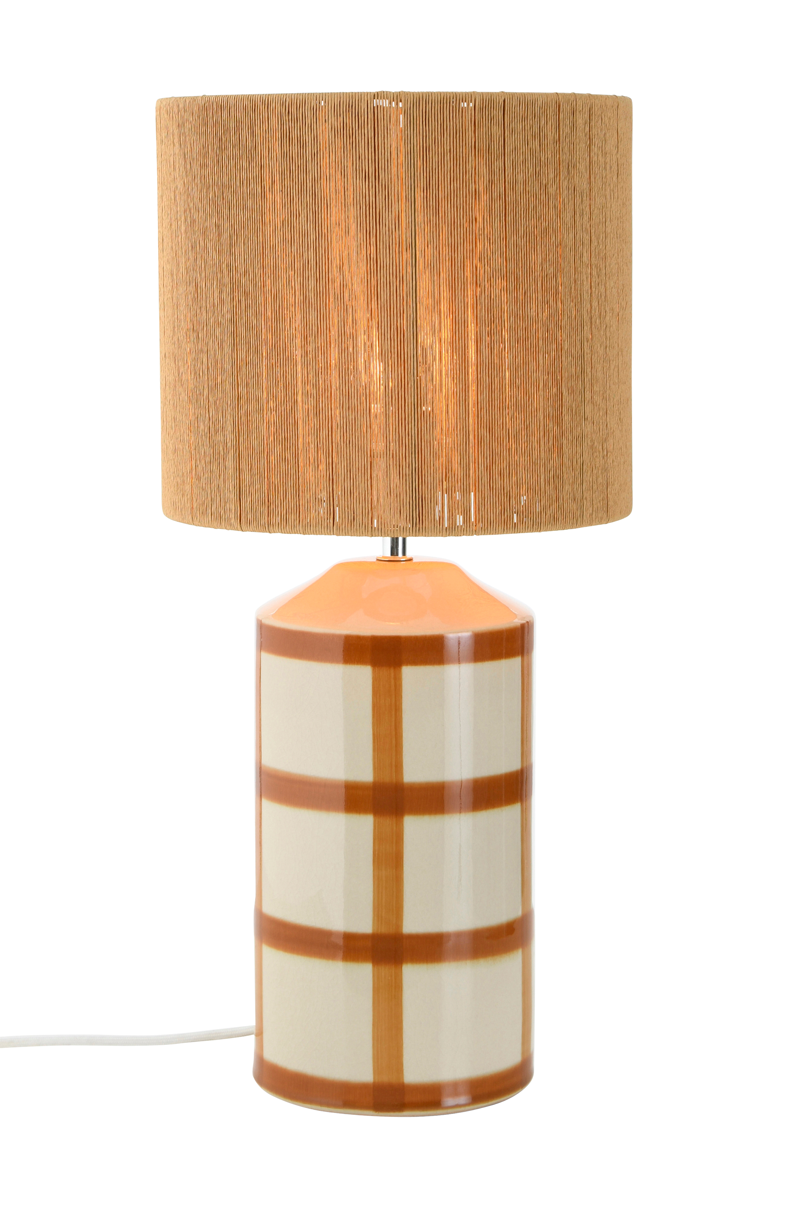 Bordslampa med fot av glaserad, rutmönstrad keramik och skärm av papperstrådar. Vit textilsladd med strömbrytare.