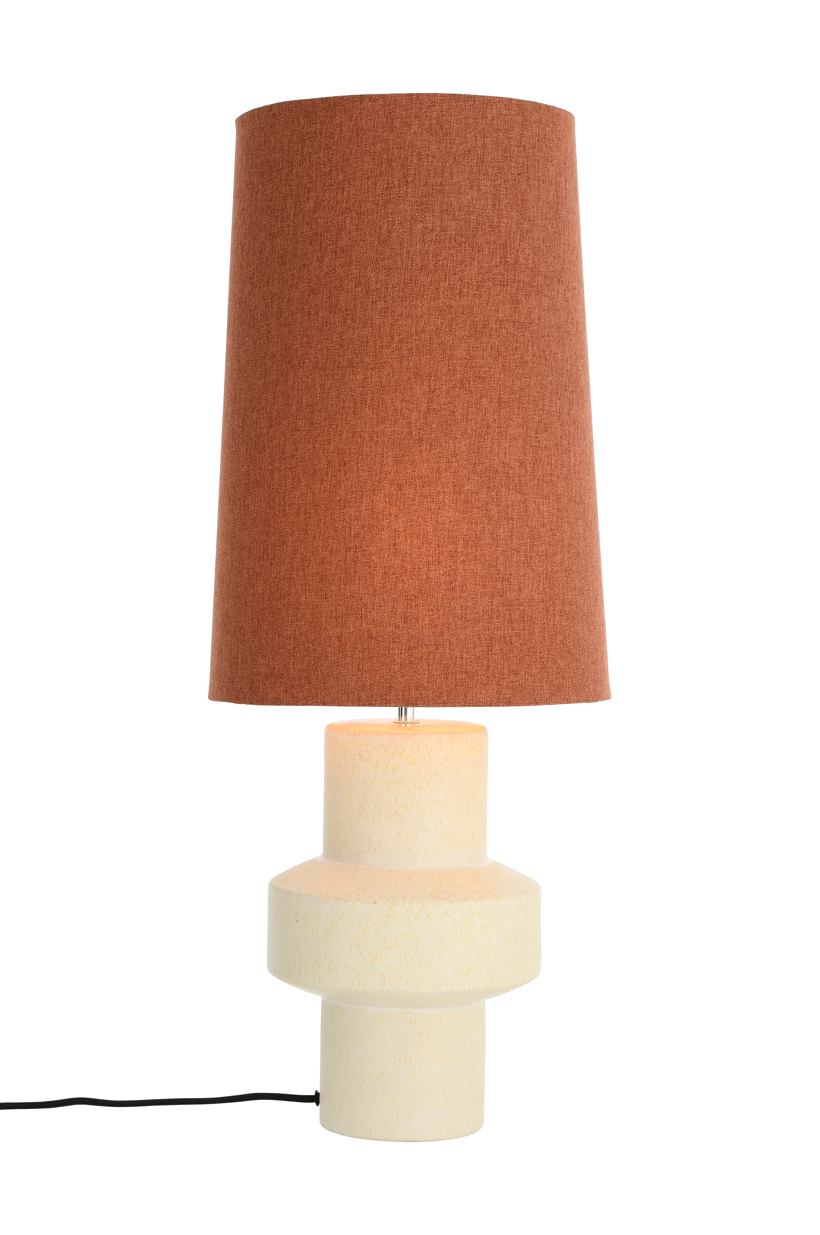 Bordslampa i retrostil med fot av glaserad keramik och en hög skärm av bomullstyg.