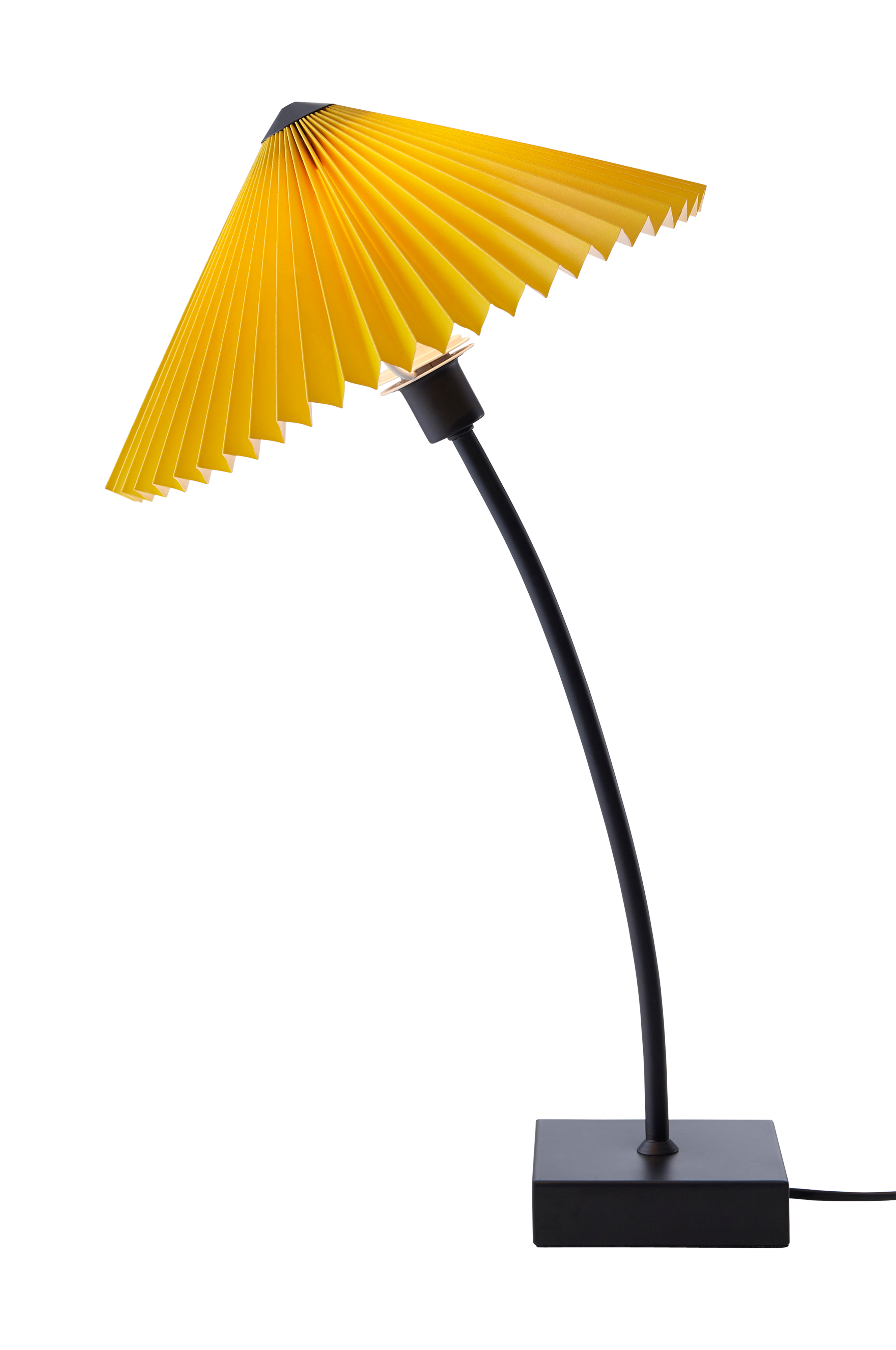 Bordslampa av metall i matt finish och plisserad skärm av papper. Total höjd 50 cm. Djup 30 cm. Skärmens mått: Ø 30 cm, höjd 15 cm. Bottenplattans mått: 28x28 cm, höjd 3 cm. Svart plastsladd med strömbrytare, sladdlängd 2 m. Sockel E14. Max 5W. Ljuskälla ingår ej.